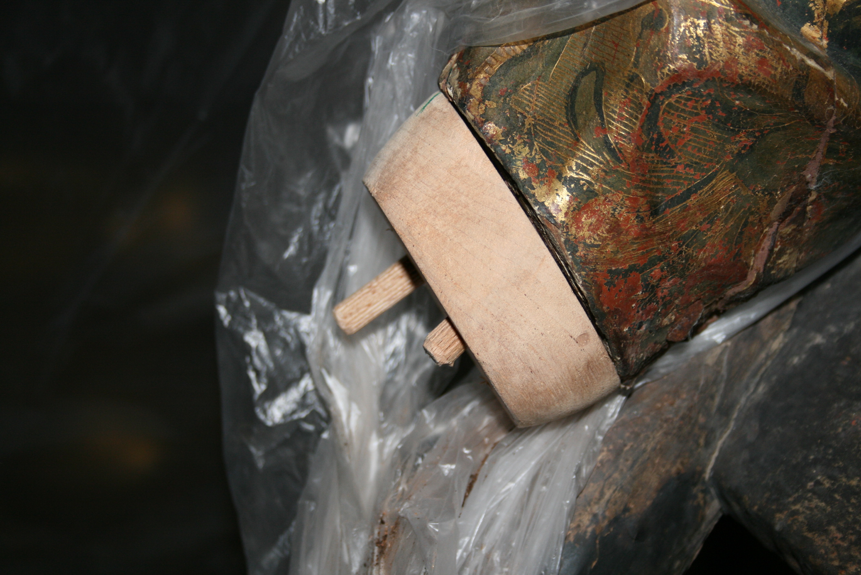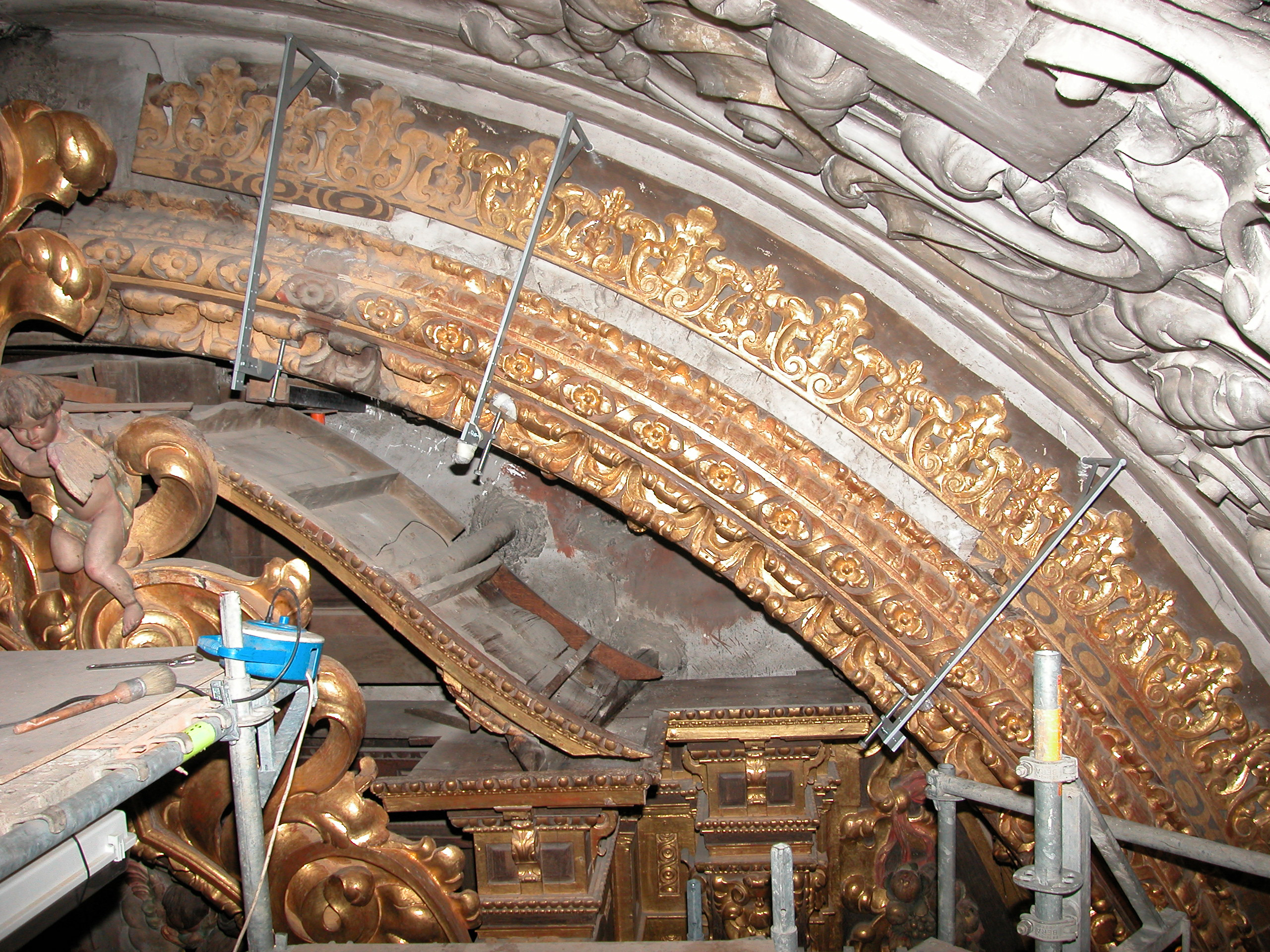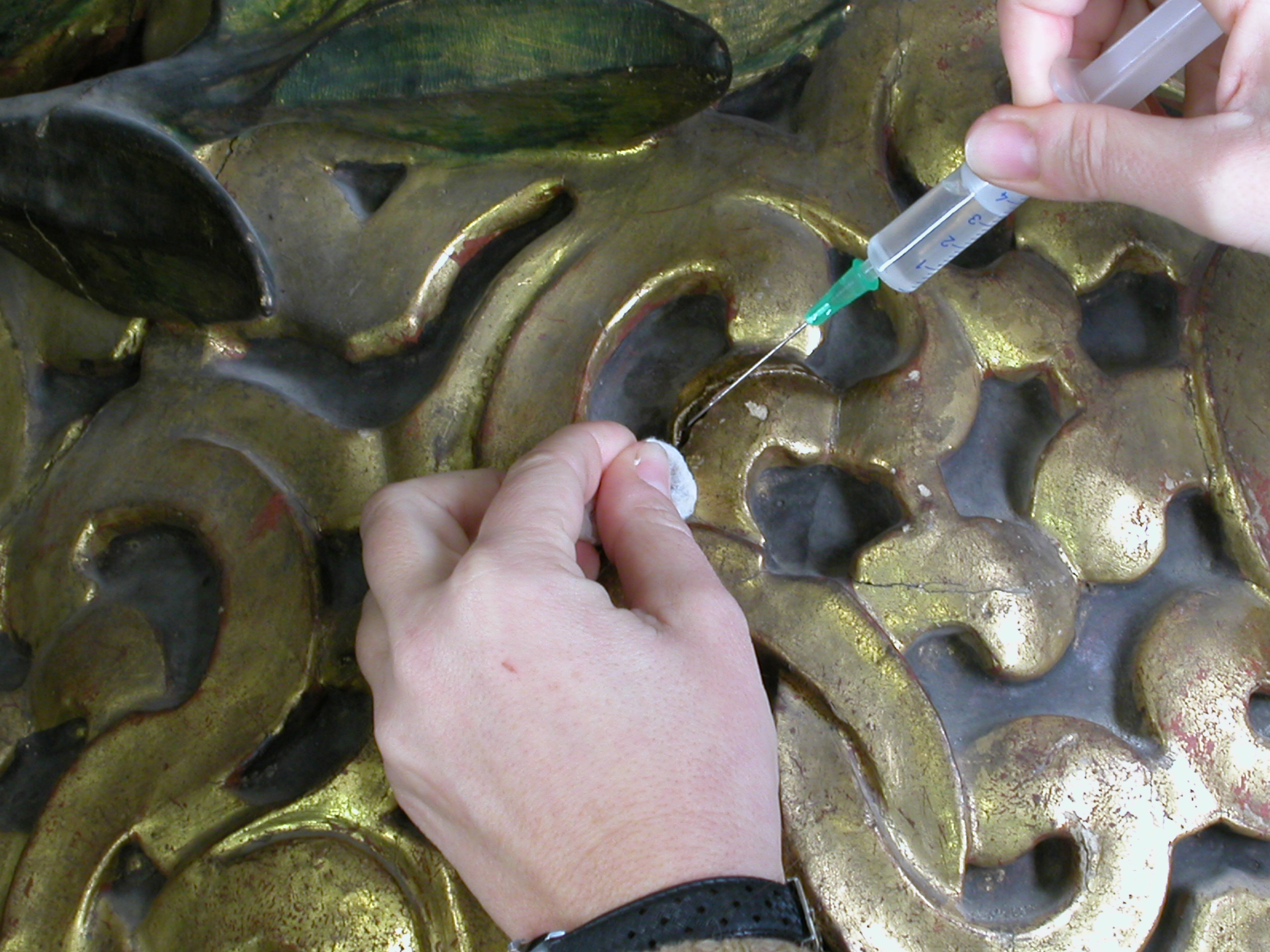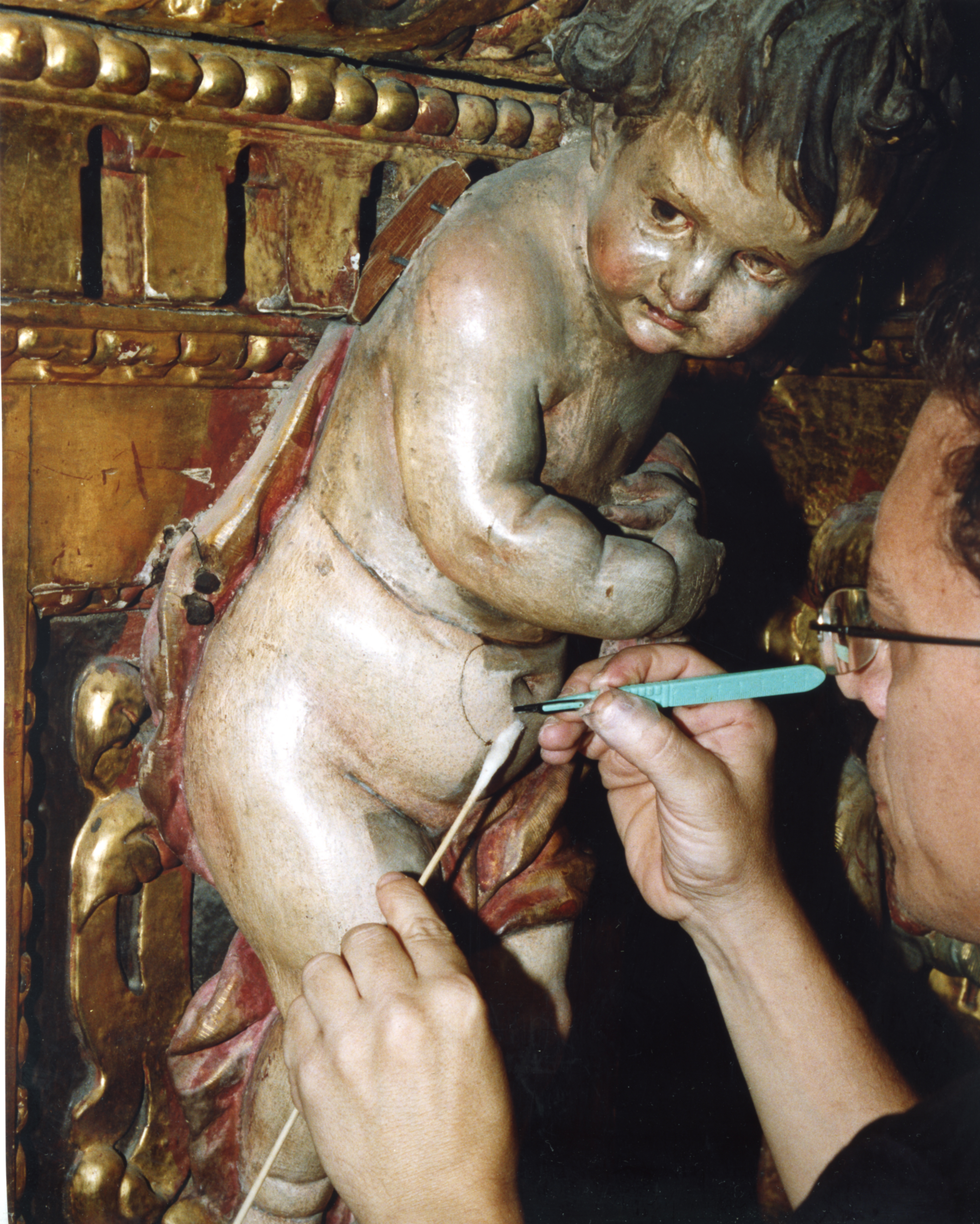 Finalizadas las labores de limpieza y eliminación de repintes, aparecieron sobre la policromía original estucos antiguos procedentes de anteriores restauraciones. Estos se retiraron de manera meticulosa ya que eran extremadamente duros y el único método eficaz fue el mecánico.