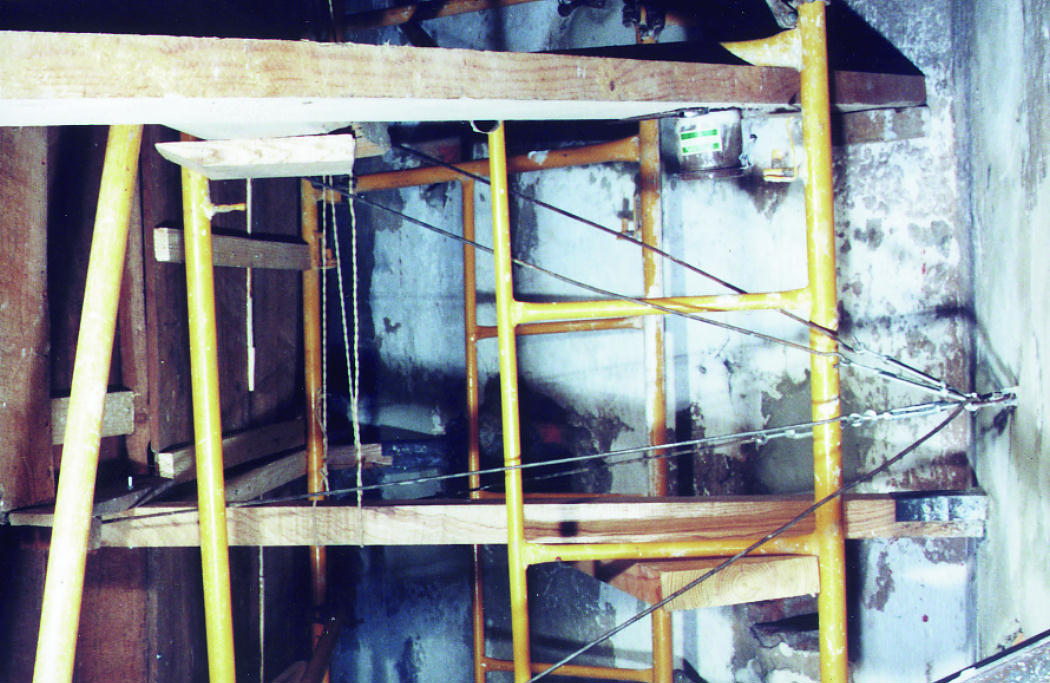 Los trabajos comenzaron por el reverso del retablo. Se realizó una limpieza superficial y se consolidó la madera con una resina acrílica disuelta en disolvente orgánico. A continuación se procedió a la consolidación de la estructura, que comprendió una serie de tareas: colocación preventiva de tensores para sujetar el cuerpo superior y evitar un mayor desplazamiento del mismo hacia afuera; eliminación de clavos, hierros y pletinas antiguas oxidadas; embarrotado de refuerzo de los distintos paneles; y finalmente, la colocación de nuevos travesaños y de un nuevo sistema de anclaje al muro mediante la inserción de tres pletinas metálicas. También se sustituyó la escalera original de madera que descansaba sobre el retablo, en estado muy precario y con numerosas reparaciones, por otra metálica insertada en el muro y se aplicó un tratamiento insecticida por impregnación e inyección en toda la superficie posterior del retablo, tanto en la madera original como en la nueva. El tratamiento efectuado en el muro consistió en la limpieza de capas de cal, fijación de los morteros, eliminación y reposición de los repellados modernos y reposición de peldaños de la escalera de fábrica de ladrillo.