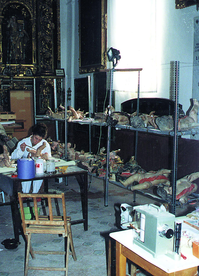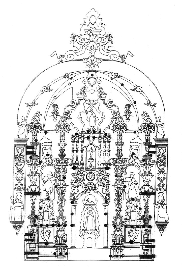 Tras el retablo mayor, a la altura del banco, una gran acumulación de escombros había favorecido el ataque de xilófagos. Los apoyos traseros, de madera de olivo, necesitaban una seria revisión en cuanto a su función, ya que algunos habían cedido con los movimientos de la fábrica y otros se habían perdido o se encontraban despegados. Muchas piezas se habían caído o se encontraban desajustadas o movidas. Los anclajes y ensambles de las distintas partes de la estructura estaban movidos y la mayoría de los ingletes, abiertos; muchos de ellos repasados con clavos para sujetarlos. Por toda la estructura se observaban restos de una instalación eléctrica de 1927 y de otra posterior. Las tallas presentaban pérdidas de elementos y serios problemas de asentado de color. Su sujeción estaba realizada con tablones clavados directamente a la escultura, dado que sus bases y asentamientos estaban inclinados y descolgados de la estructura general, por lo que existía un gran riesgo de caída.