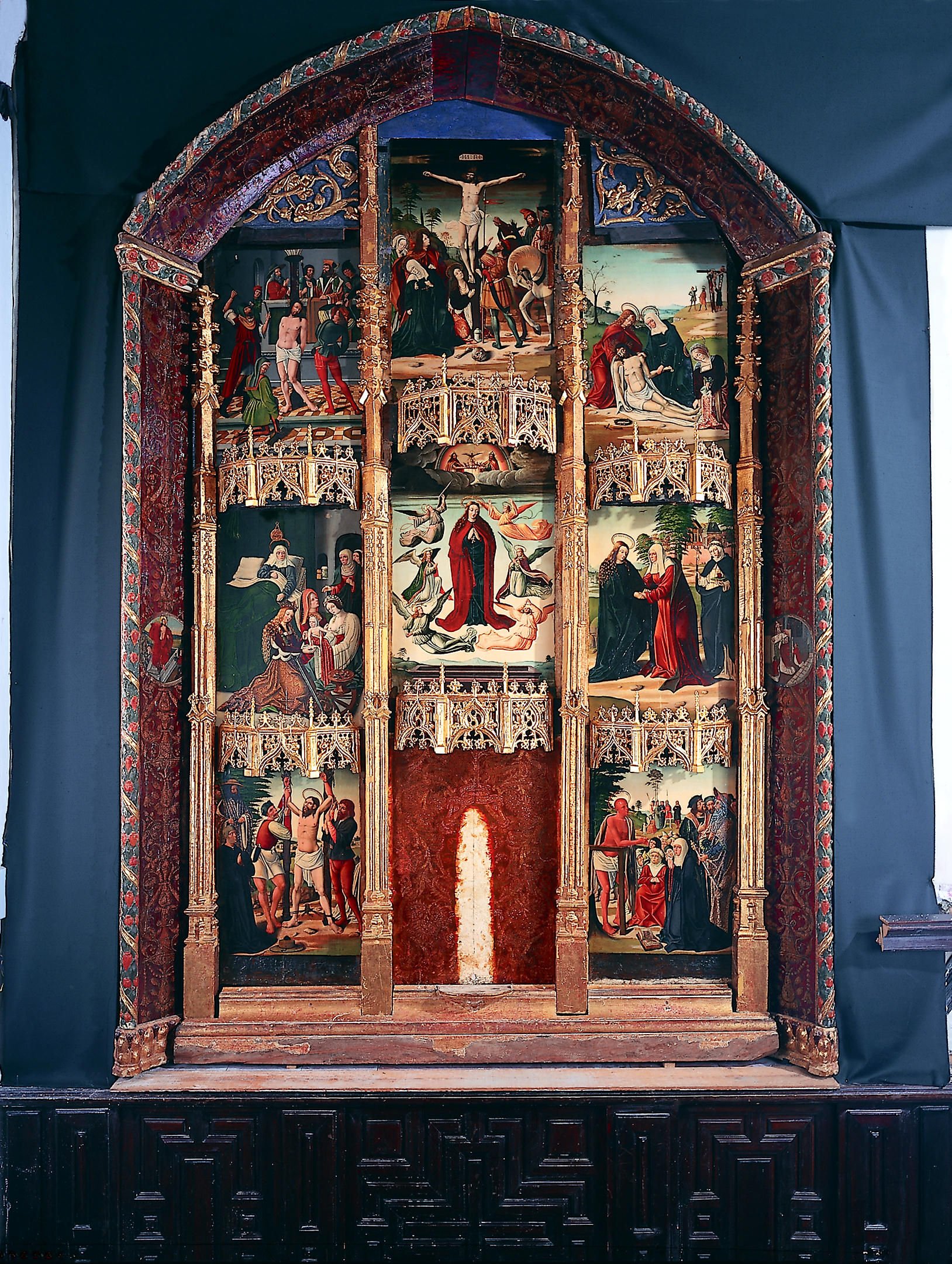 El retablo gótico fue desmontado tras una limpieza superficial y una fijación de los estratos con peligro de desprendimiento. Se limpiaron los reversos, se fijó la policromía y se aplicó a la madera un tratamiento insecticida y otro de consolidación mediante impregnaciones por el reverso. Tanto en las tablas como en las piezas que componen el arco del guardapolvo se rellenaron o enchuletaron las uniones abiertas, ya estabilizadas. En la tabla de la Quinta Angustia además hubo que desmontar los barrotes; se fijaron con espigas de madera encoladas y el superior, algo desplazado, se colocó en su lugar original.