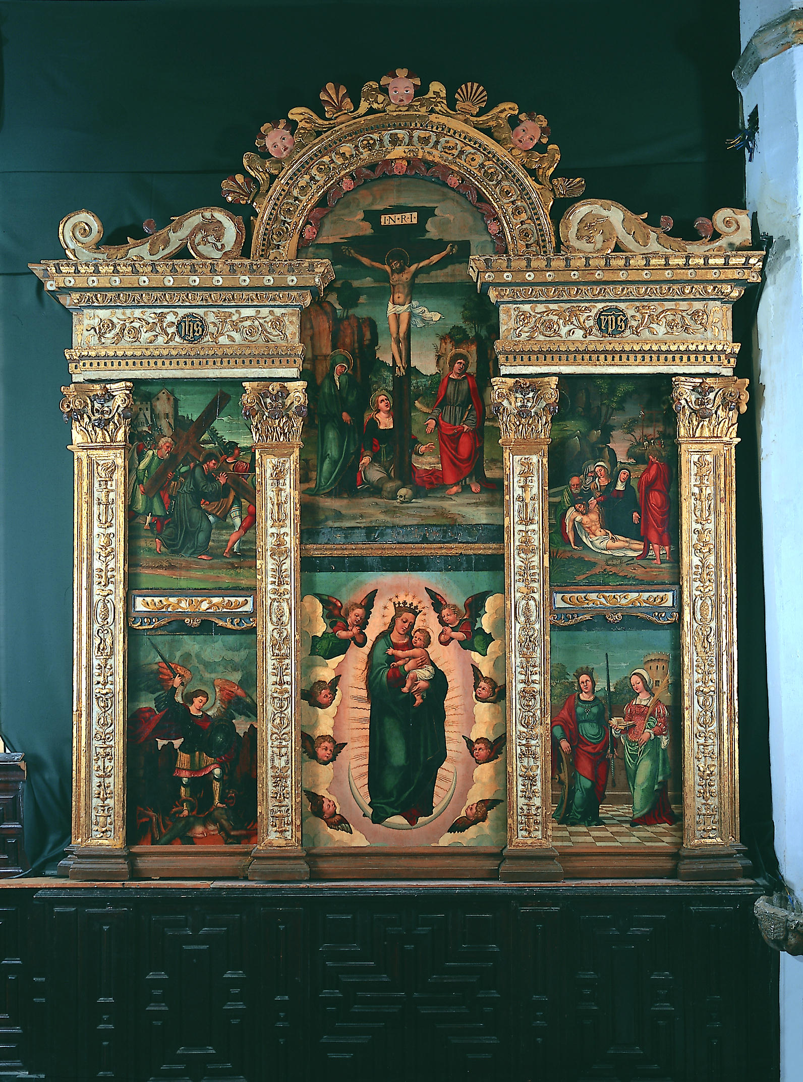 El retablo plateresco también fue desmontado después de hacer una limpieza del polvo y fijar los estratos mal adheridos con riesgo inminente de caída. Se limpió el reverso, se fijó la policromía, se desinsectó la madera y se consolidó. Se repusieron las colas de milano y los travesaños perdidos y se volvieron a ensamblar las piezas que formaban el medio punto de remate del retablo. También se repusieron algunos fragmentos de moldura y decoración escultórica y se sellaron numerosos orificios, especialmente en el perímetro de las tablas. Debido al irregular aspecto de la película pictórica hubo que aplicar distintos disolventes y métodos de limpieza según la zona a tratar. Se estucaron y reintegraron las lagunas mediante un rayado de acuarela y pigmentos al barniz; esta reintegración también se empleó para matizar y solucionar el barrido de color. En los dorados se aplicó una tinta neutra. Finalmente se protegieron dorados y policromías. El sistema de montaje fue similar al empleado en el retablo anterior.