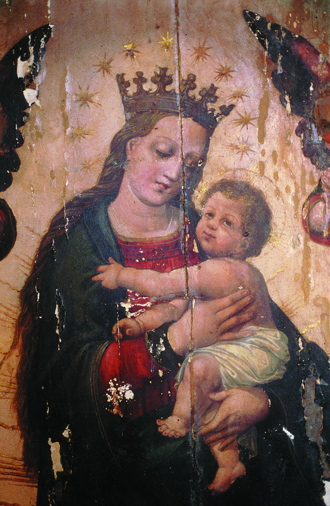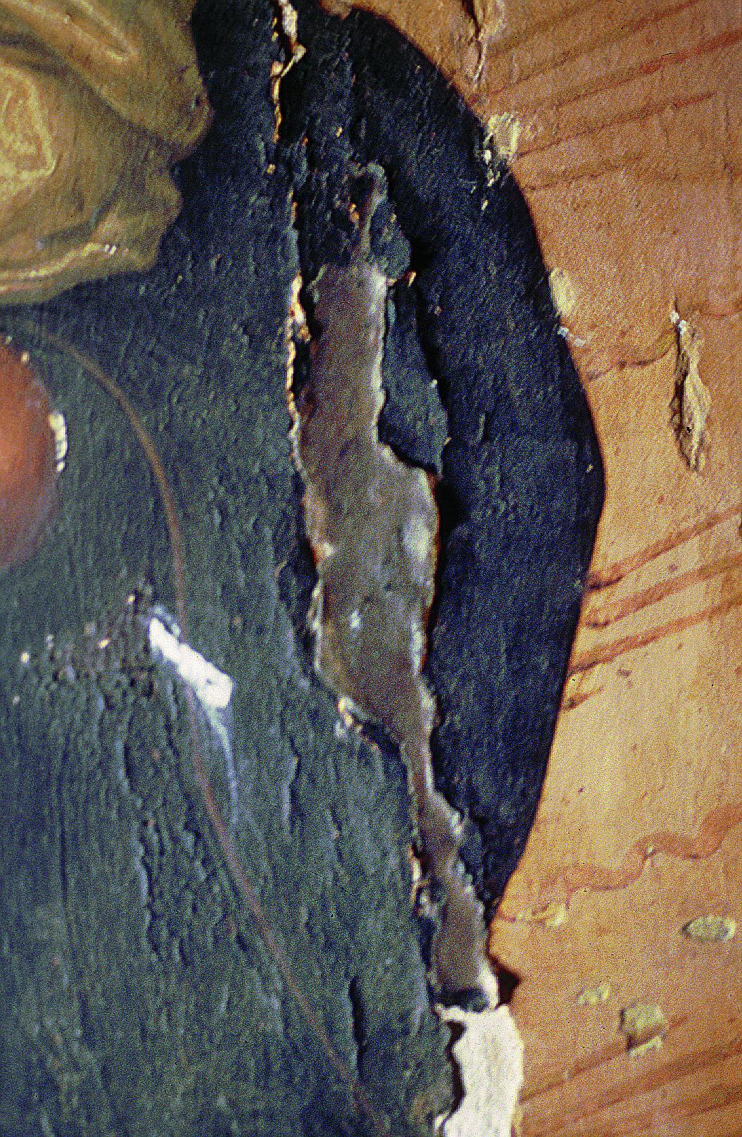 En el reverso de la tabla de la Piedad se localizó la leyenda “se restauró” junto con la fecha “8-10-40" a lápiz. Fruto de esta intervención era la convivencia de zonas de acumulación de suciedad con otras con el estrato pictórico barrido. Las numerosas pérdidas de preparación se habían pretendido ocultar con una fina pintura oleosa aplicada directamente sobre la tela, salvo en la tabla de la Virgen con el Niño, donde la reintegración de las lagunas se había realizado con cera. Ésta, incompatible con los materiales originales, produjo cazoletas; además la reintegración cromática realizada sobre ella presentaba tonos opacos que contrastaban vivamente con el original.