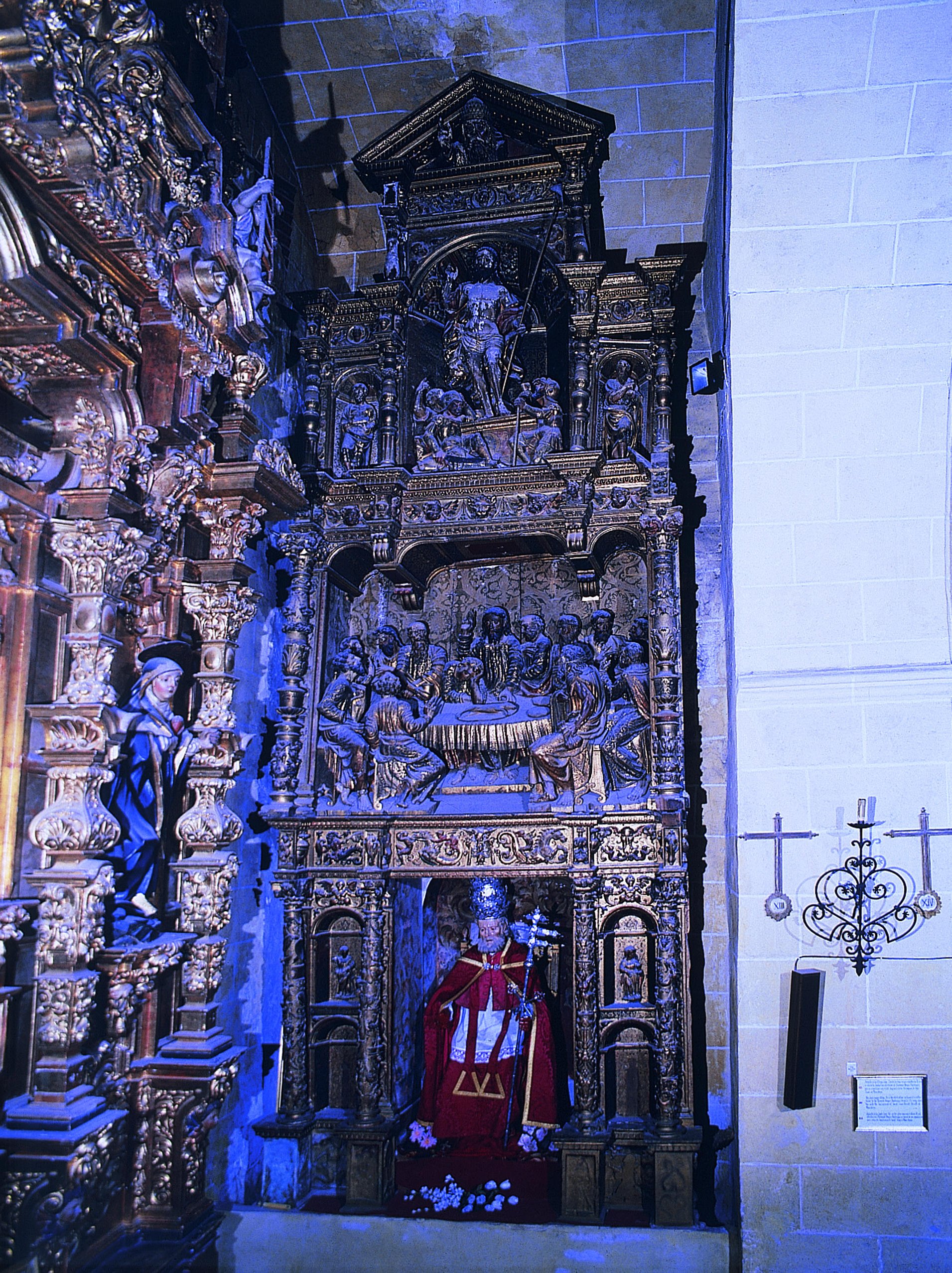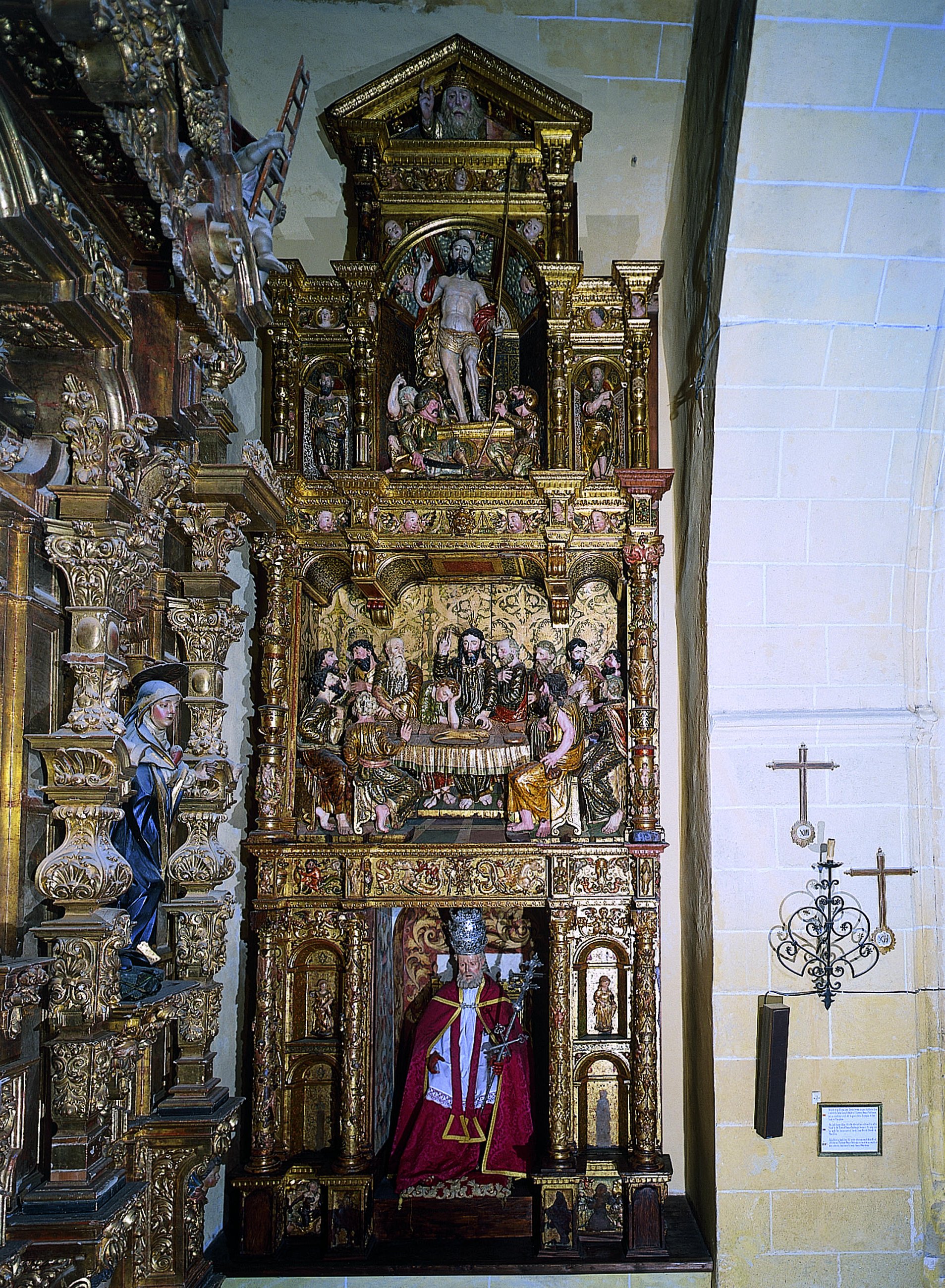 En el banco figuran dos relieves, uno de San Jerónimo penitente y el otro de la estigmatización de San Francisco. Sobre ellos, a ambos lados de la imagen del titular, se encuentran cuatro hornacinas que en su momento debieron estar ocupadas por figuras alegóricas de las cuatro virtudes cardinales. De ellas se conservan las dos superiores, la Fortaleza y la Fe. Los cuerpos superiores están ocupados por dos altorrelieves, uno con la Santa Cena, en el segundo cuerpo, y otro con la Resurrección, en el ático, éste flanqueado por dos figuras de San Pedro y San Pablo. En la hornacina donde se ubica el relieve de la Resurrección se han observado puntos de anclaje que no se corresponden con él, lo que viene a demostrar que sustituyó a una obra escultórica anterior. El retablo se corona con un frontón triangular con el busto de Dios Padre.