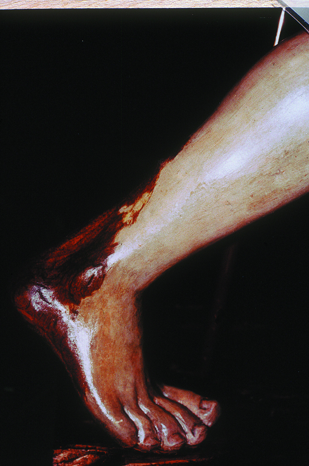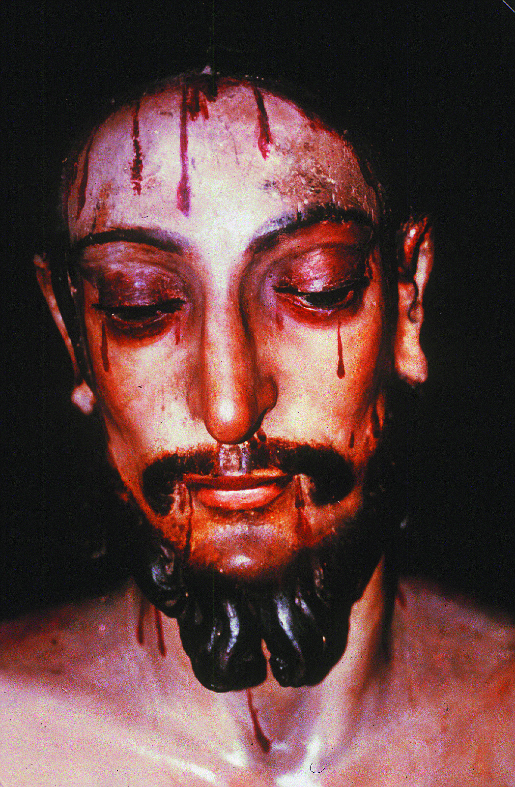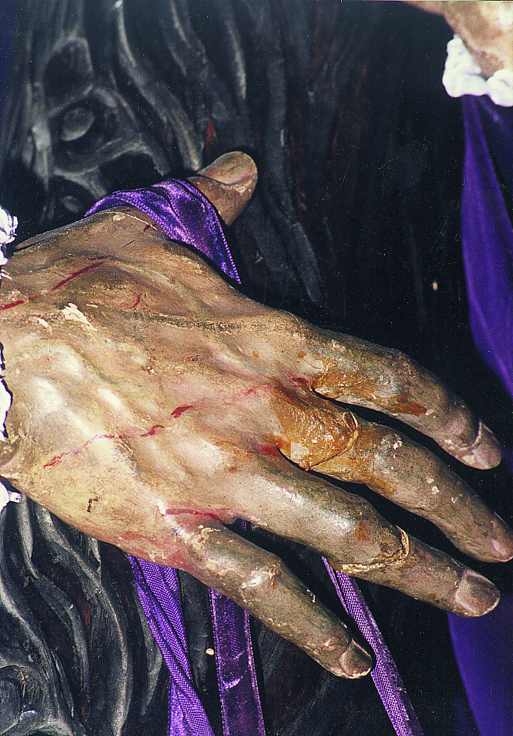 El sudario había sido cepillado por la parte posterior porque, al parecer, sobresalía demasiado al colocarle la túnica. La mano derecha tenía varias falanges rotas y mal pegadas, y el pie derecho también se había roto y pegado recientemente. El adhesivo utilizado fue, según la hermandad, una resina epoxídica. La cabeza estaba llena de agujeros pequeños de colocar antiguamente una corona de espinas y tres agujeros grandes, dos de ellos tapados con espigas, de unas potencias. Y en distintos puntos del brazo izquierdo se localizaban ataques de hongos de pudrición parda, hecho que podría estar relacionado con la noticia de que en el año 36 la cabeza y una de las manos fueron escondidas en una cesta en el interior de un pozo.