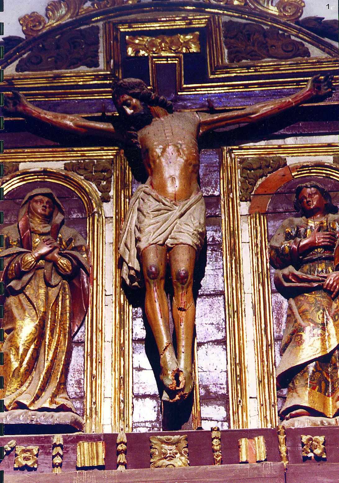 Gran parte de los daños que presentaba la escultura habían sido causados en el curso de anteriores intervenciones. La más importante tuvo lugar al colocar la imagen en el retablo de forma totalmente paralela al plano de la cruz, para lo cual se mutiló el reverso y se readaptaron los ensambles de los brazos hasta conseguir llevarlos hacia adelante y anular el arqueo y la tensión propia de los mismos. Por alguna razón, en ese o en algún otro momento, fueron amputadas también las manos y sustituidas por otras. A esto se suma la rotura de las piernas y la pérdida de fragmentos en ambos pies, ocasionados por golpes sufridos durante la Guerra Civil, según el testimonio popular. Por otra parte, la desaparición de parte del cabello y la presencia de numerosas perforaciones evidencian cambios de coronas y potencias a lo largo del tiempo.