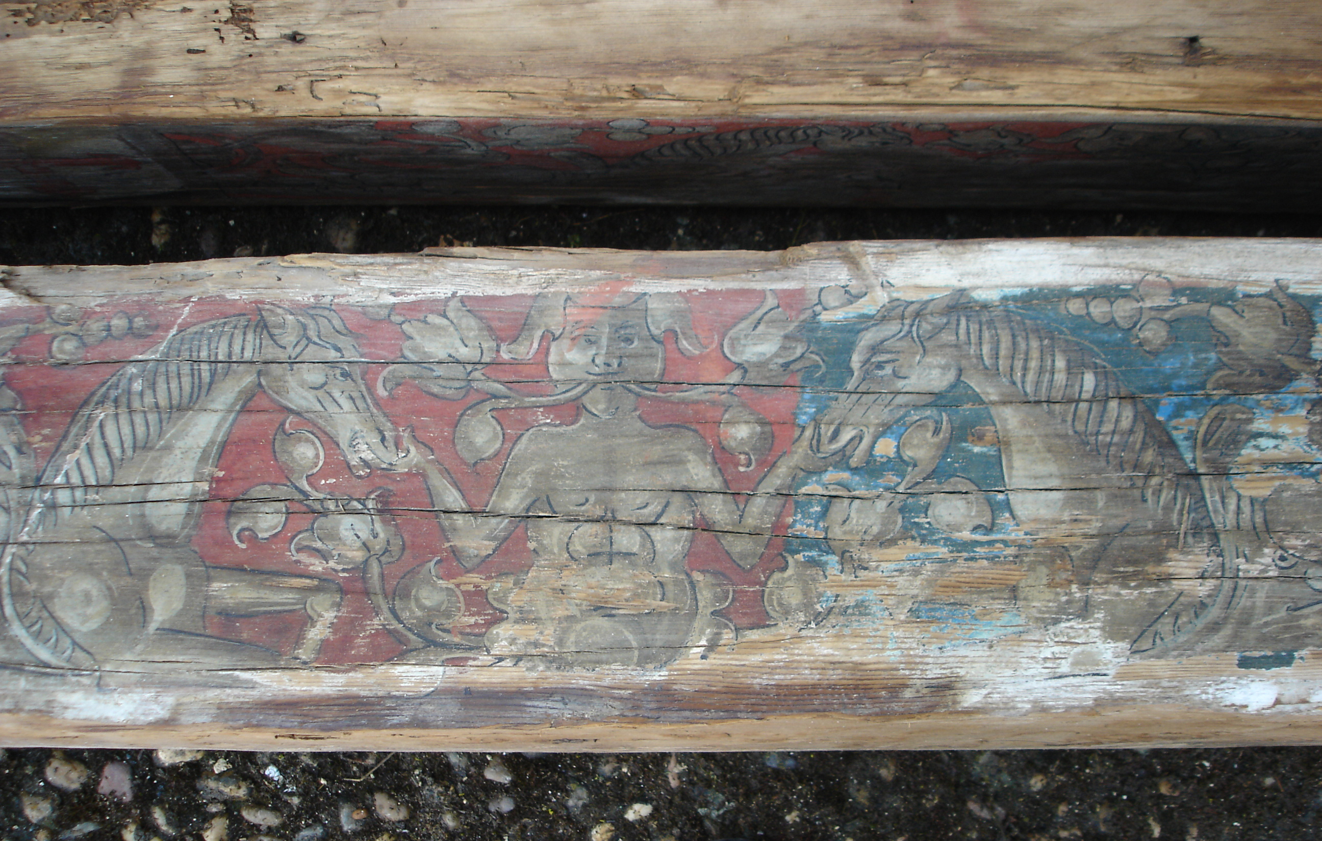 Existen pinturas policromadas sobre las maderas estructurales de la cubierta oculta, por la bóveda encamonada de aristas, de la nave del evangelio y de la epístola, en pares, correas y tablazón de esta zona.