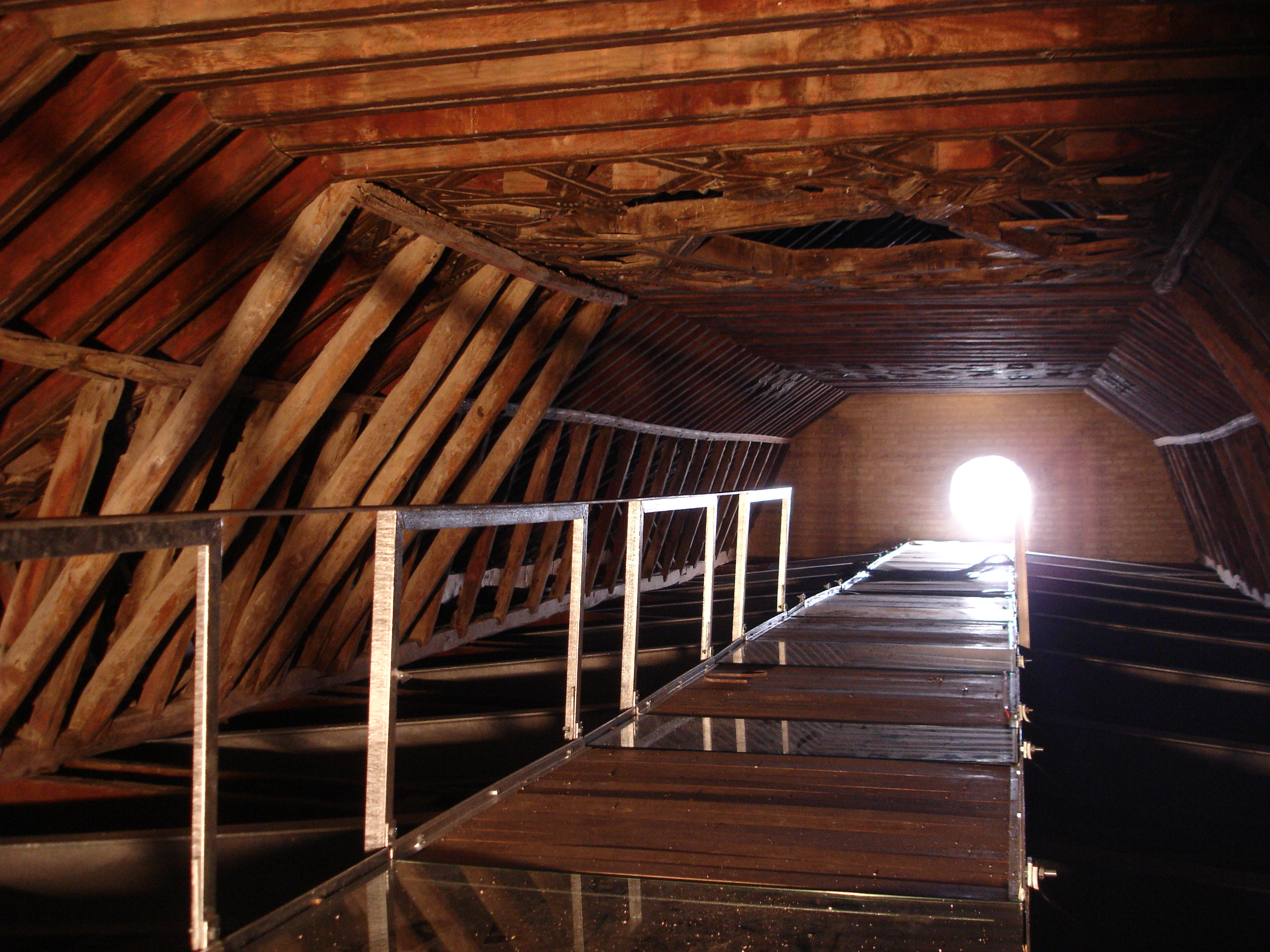 Existe una viguería de valor oculta tras las bóvedas encamonadas, pero siguiendo los criterios adoptados de restauración, no queremos apostar por ningún periodo histórico en detrimento de otro, ni llevar la edificación a una especie de museo de momentos históricos que le hagan perder su conceptualización espacial. Por ello se ha proyectado una pasarela peatonal de mantenimiento y registro, que se utiliza desde un primer momento en la ejecución de la obra, como estructura auxiliar del apuntalamiento para reparación de los elementos estructurales de la cubierta de madera, y que a la terminación de las mismas pueda seguir utilizándose como plataforma de vigilancia del camaranchón, entre el intradós de la cubierta de madera y el trasdós de las bóvedas encamonadas, y como observatorio de visita.