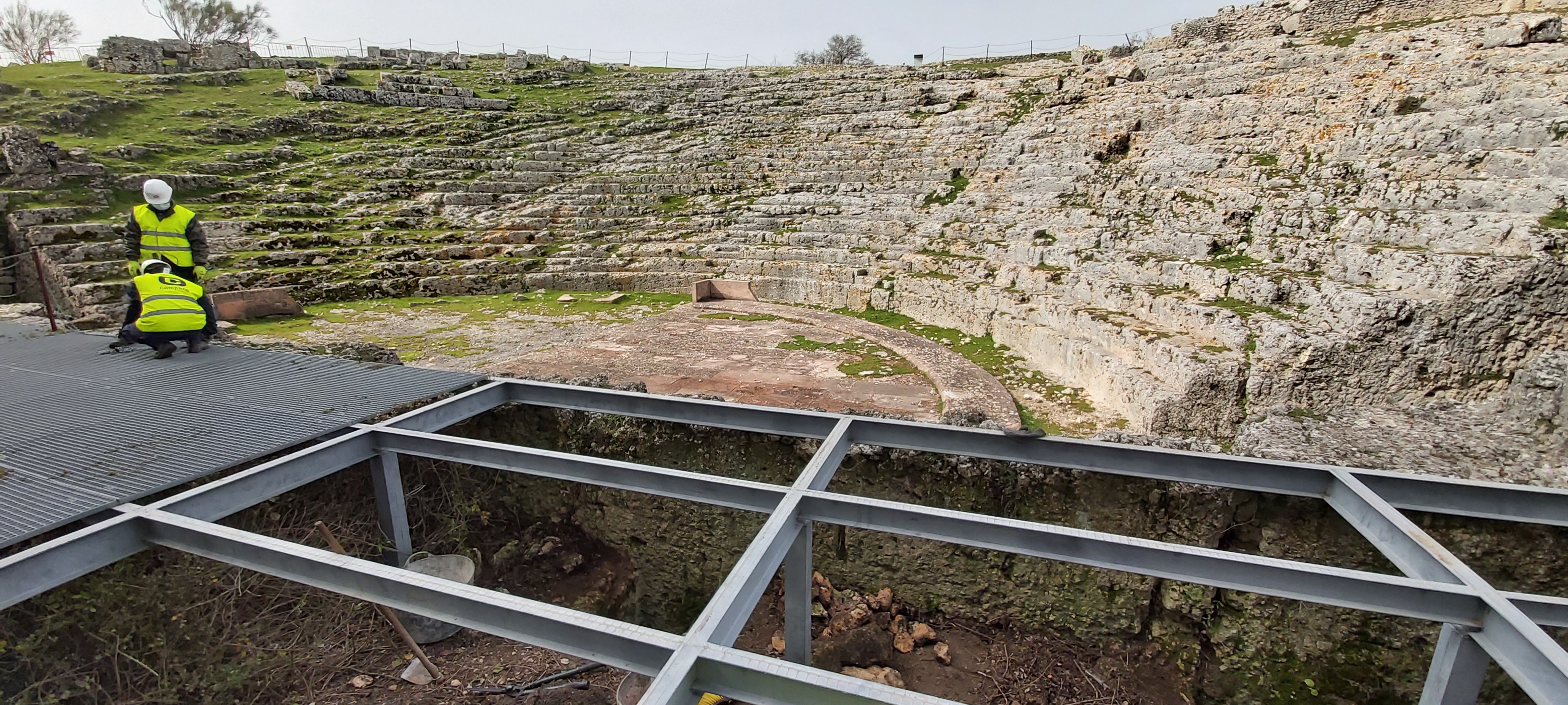 En relación a la limpieza del hiposkenium y la cávea, cabe destacar la aparición de diferentes estructuras que pueden ayudar al conocimiento del funcionamiento interno de los teatros, como son las pequeñas hornacinas localizadas en el hiposkenium interpretados como posibles espacios para las personas encargadas del funcionamiento interno del teatro; los seis pozos posiblemente de anclaje del telón; el balteus de la grada noroeste; agujeros para postes en la summa cavea; o los canales de evacuación de aguas.