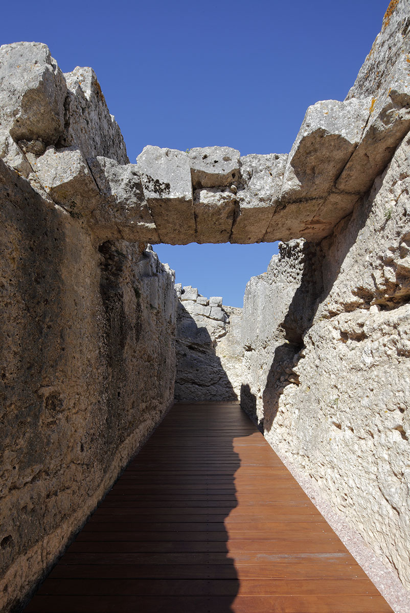 El sistema defensivo que rodea toda la parte accesible de la ciudad es visible en superficie, conservando lienzos de murallas ciclópeas, con torres circulares y cuadradas, observables en la ladera oriental de la mesa de Ronda la Vieja. También se conserva la puerta monumental sur de la ciudad, en buen estado de conservación.