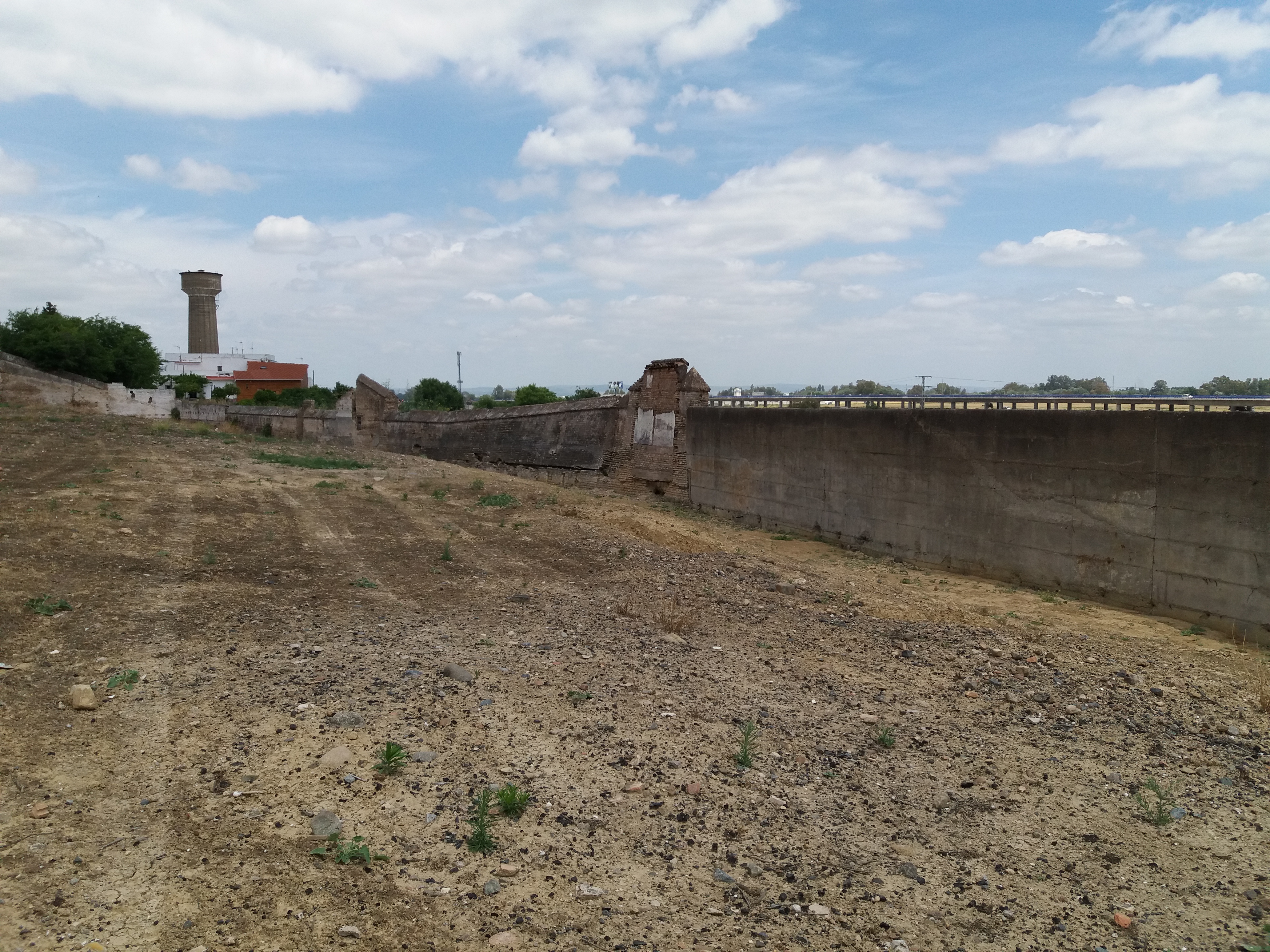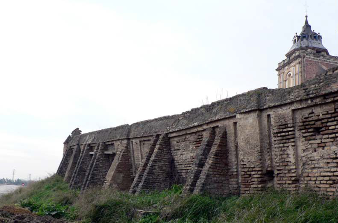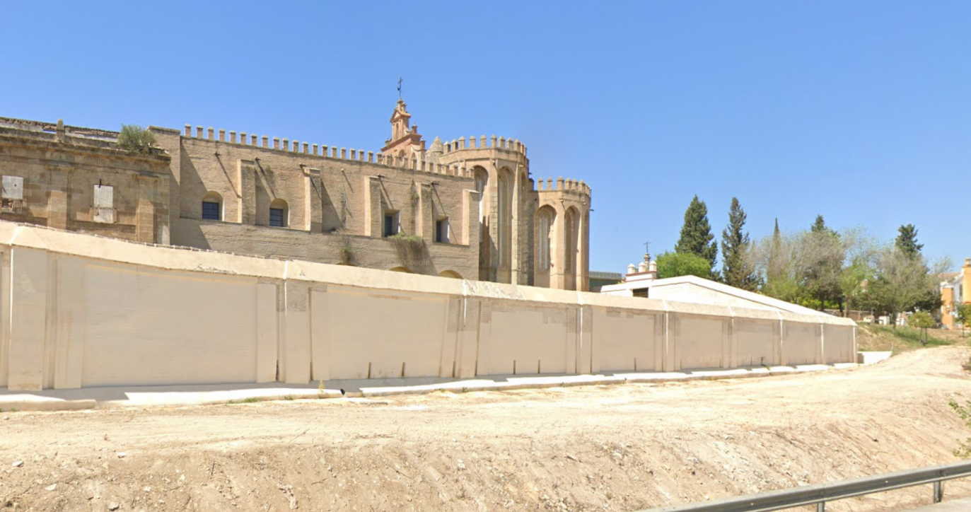 En dicho lado oriental, corriendo al pie de la ladera que desciende desde la cota superior del recinto monacal hacia la inferior de la vega del río Guadalquivir, encontramos dos tipos de cerramiento:
