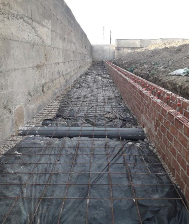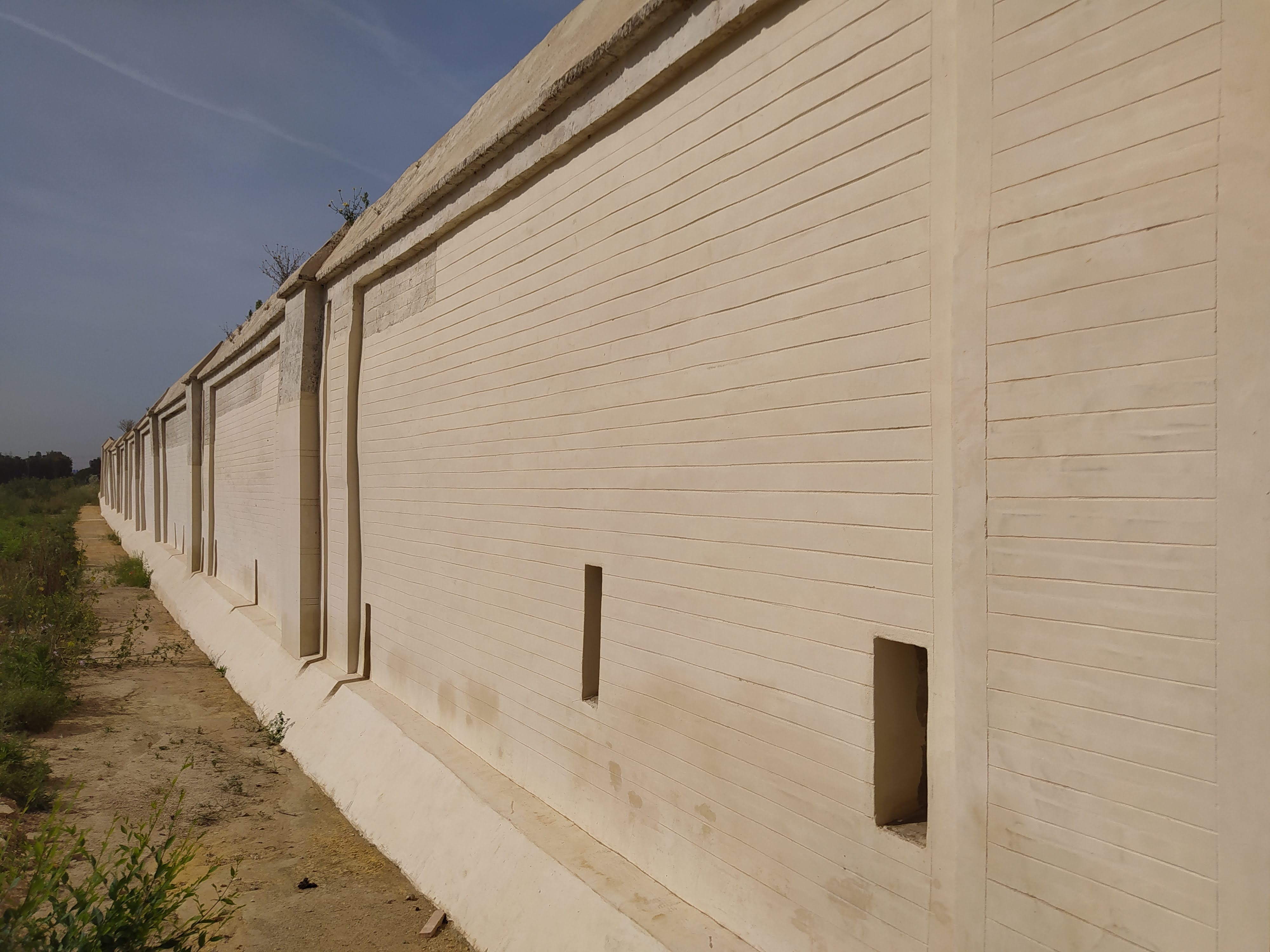 Murete de fábrica de ladrillo macizo (29 x 14 x 5 cms) revestido con revoco de cal apoyado sobre una zapata de hormigón armado HA-30.