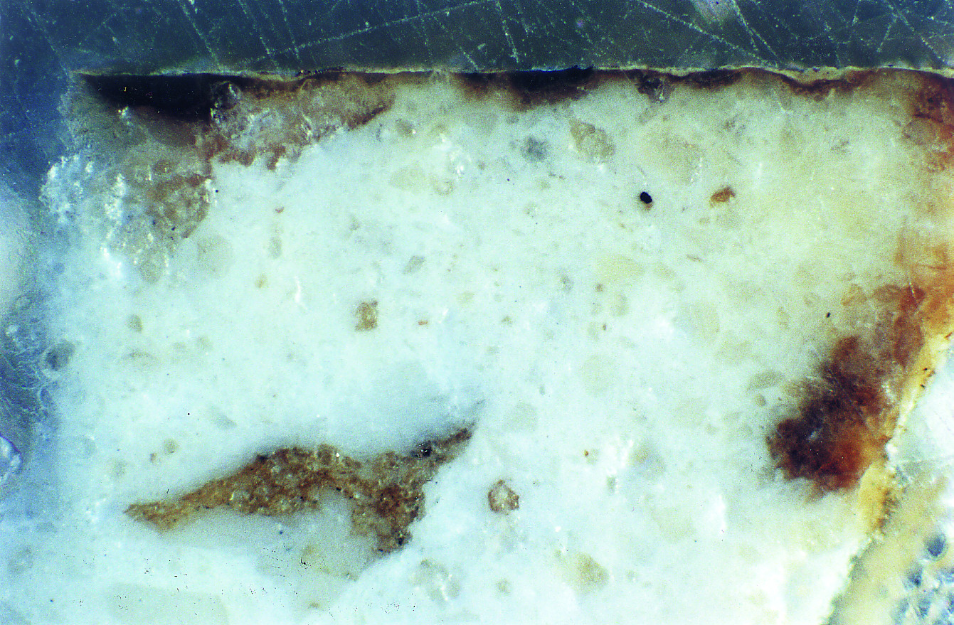 A través de catas y estratigrafías se detectaron en las carnaciones tres policromías diferentes pertenecientes a distintas épocas, aunque la original solo se conserva en algunas zonas de los pies y espalda. Por efecto del calor provocado por el incendio de la iglesia se habían originado numerosas ampollas de mediano tamaño en los brazos y el pecho, y algo más pequeñas en el cuello y el rostro. Toda la superficie de la escultura estaba cubierta de humo y polvo y deteriorada por golpes y roces. Los repintes sobrepasaban las lagunas y ocultaban la policromía, sobre todo en el sudario, repintado con temple y posteriormente retocado con purpurina, y en la cruz, a la que se había aplicado betún de judea. En las carnaciones, las lagunas de mayor tamaño se habían rellenado con cera y repintado con óleo.
