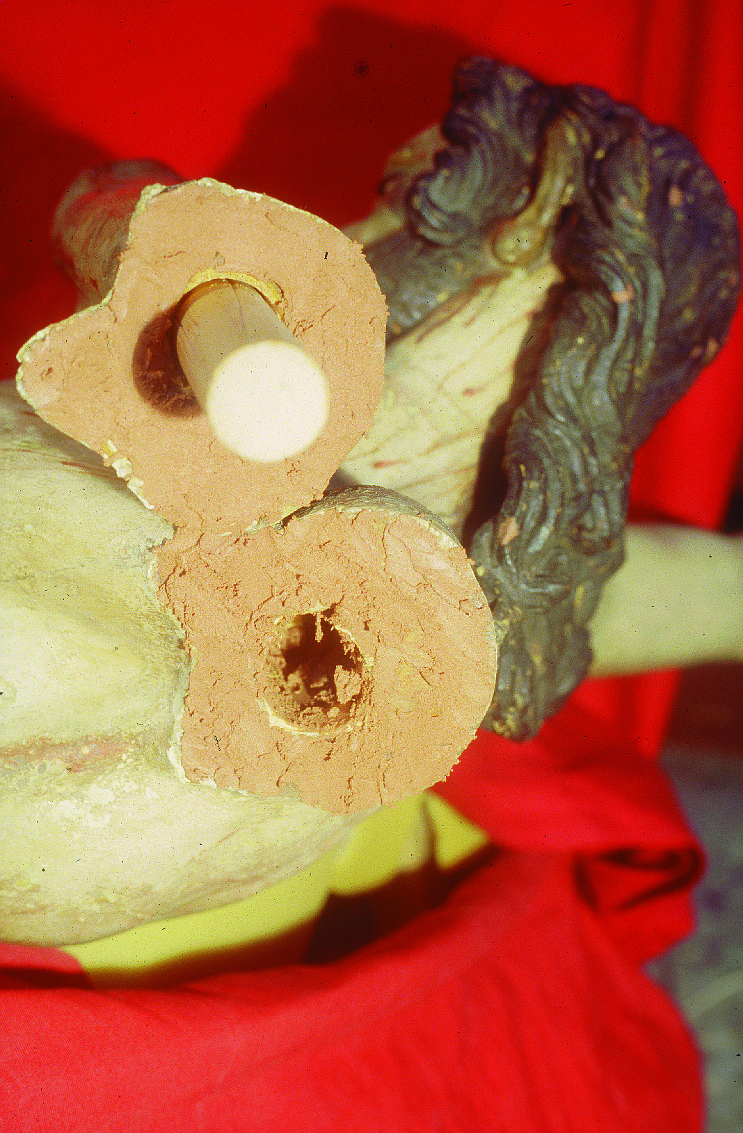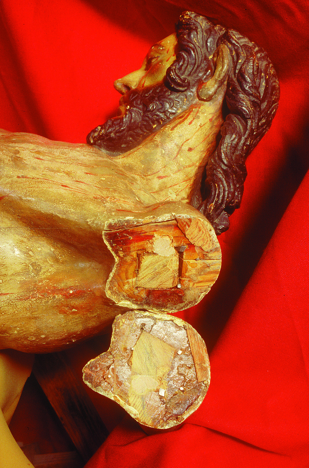Tras la fijación de los estratos pictóricos, se separaron los brazos y se colocaron en las uniones tiras de papel japonés encoladas para evitar posibles desprendimientos de la policromía. Una vez extraídos los clavos que los sujetaban, se observó que en fechas anteriores a esta intervención se había ampliado el hueco del ensamble del hombro derecho para introducir en él cuñas y se había reforzado con espigas el ensamble del hombro izquierdo. Según se comprobó, las distintas piezas estaban sueltas y las colas cristalizadas. Éstas fueron eliminadas mecánicamente, en algún caso reblandeciéndolas previamente con cola blanca. Se quitaron todas las piezas añadidas y se procedió a un nuevo ensamblado utilizando espigas y pasta de madera, y en el brazo derecho colocando una nueva cuña.