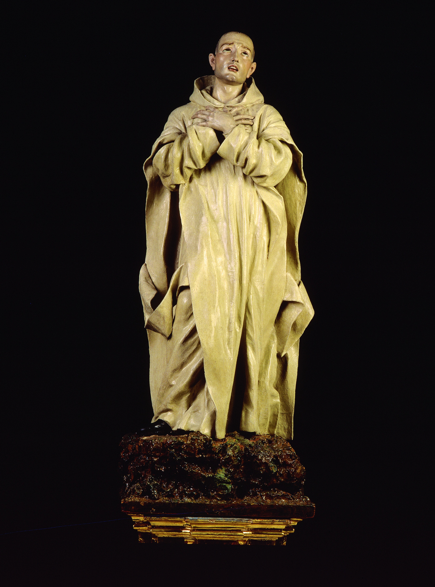 La escultura está tallada en madera de pino, aunque también se utilizaron telas encoladas en los bordes y en las trabas del escapulario, en la orilla superior de la capucha, en el borde inferior del hábito y en las mangas de la camisa interior. También se emplearon cristal en los ojos, hueso en los dientes y pelo natural en las pestañas. El santo se encuentra de pie sobre una roca de corcho con añadidos originales de pequeñas piedras naturales y fragmentos de madera para conseguir un mayor realismo. En la parte trasera de la cabeza tiene clavada una pletina metálica original, que seguramente sujetaba una aureola o nimbo que ya no existe. Todo el conjunto se apoya en una peana de madera dorada con motivos decorativos vegetales de fecha posterior.