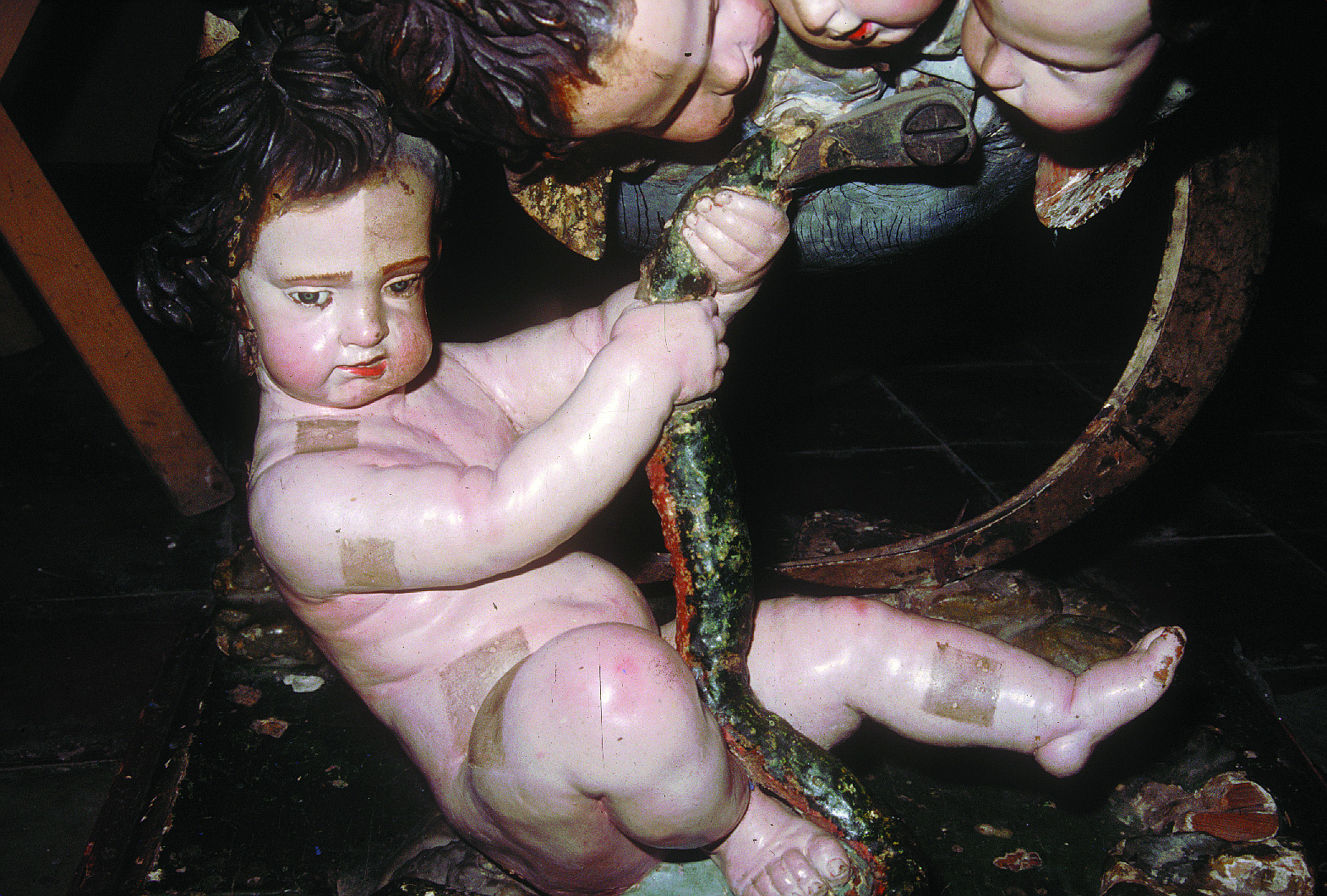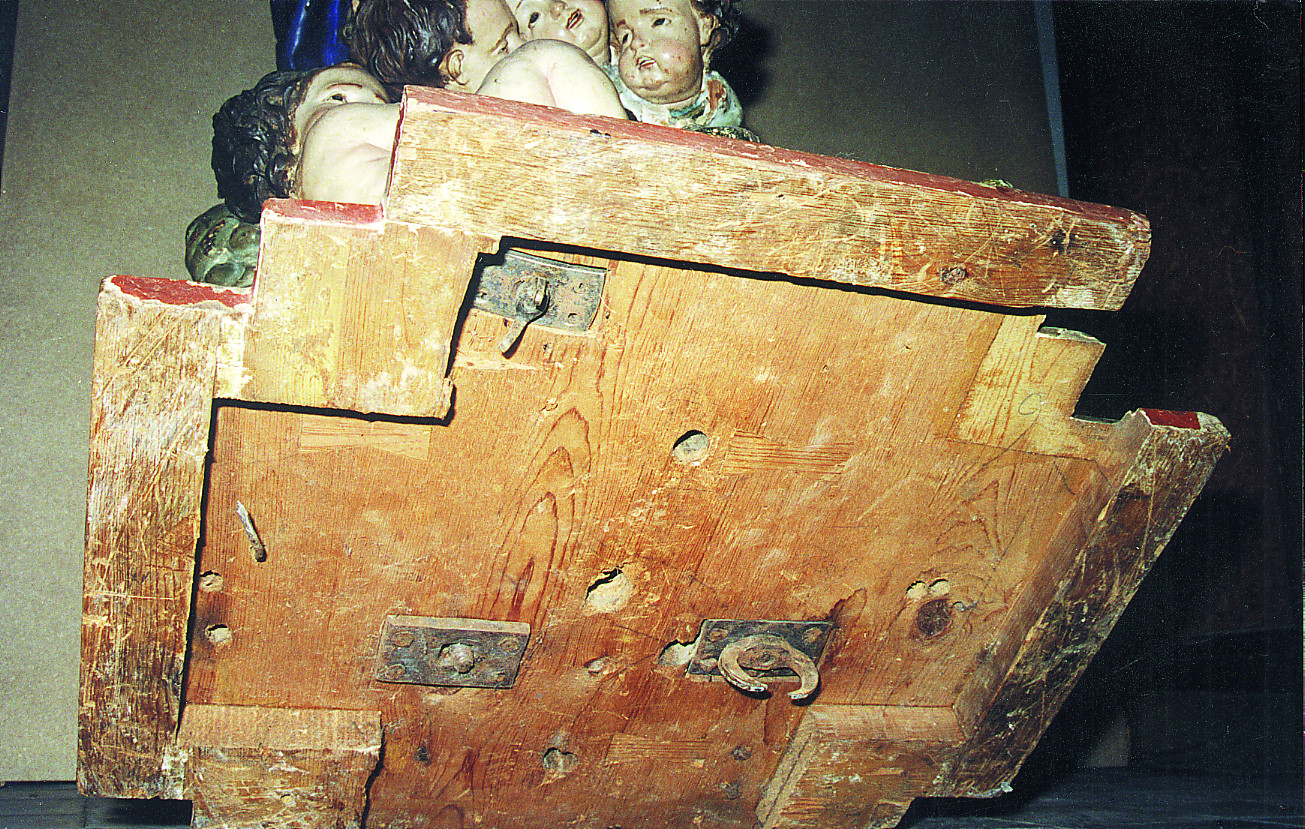 La escultura, compuesta por diversas piezas, se hallaba ligeramente agrietada pese a que las uniones se habían reforzado con telas encoladas, espigas de madera y abundantes elementos metálicos. La peana se había alabeado y además faltaba una de las tuercas de fijación de la Luna, lo que creaba inestabilidad en el conjunto.