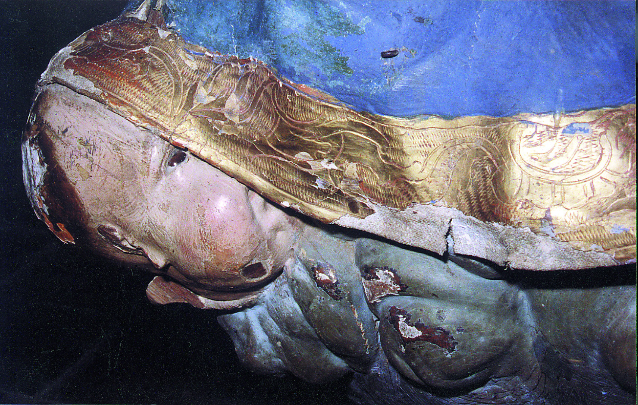 Se extrajeron diversas muestras para la realización de estratigrafías. En ellas se constató la superposición de hasta cuatro policromías en algunos elementos. Se decidió eliminar los repintes de mala calidad y respetar los que se correspondían con una misma intervención, realizados durante el siglo XVIII o a principios del XIX con materiales de buena calidad y aplicados con buena técnica. Así se eliminó la policromía al óleo del manto y se recuperó otra anterior al temple.