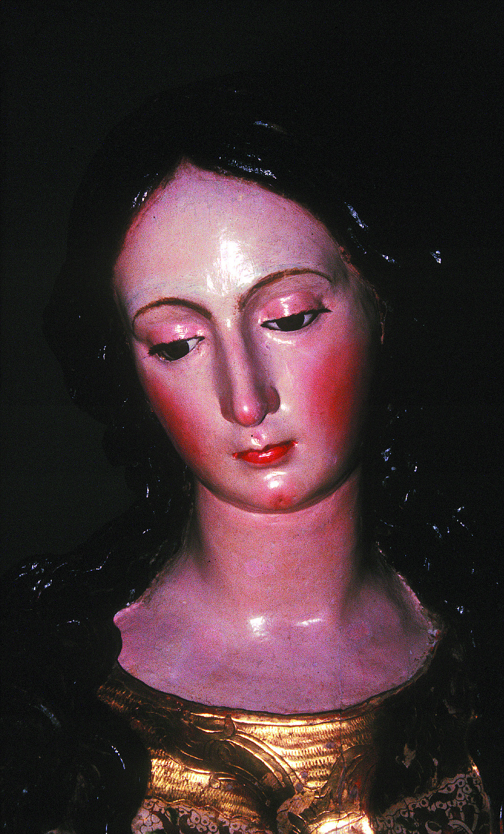 La policromía original era al óleo en las carnaciones, mientras que para los estofados de los ropajes y de la nube, para los elementos de hierro y para la peana se utilizó el temple. En el pelo, el color está aplicado directamente sobre la madera, sin preparación. Esta policromía se conservaba solo parcialmente y se encontraba oculta por repintes. En otros tiempos, durante las limpiezas y para refrescar los colores se habían utilizado materiales como goma laca, patata, cebolla o clara de huevo. Los dorados y plateados presentaban barridos por exceso de limpieza y, en la peana, repintes de purpurina.