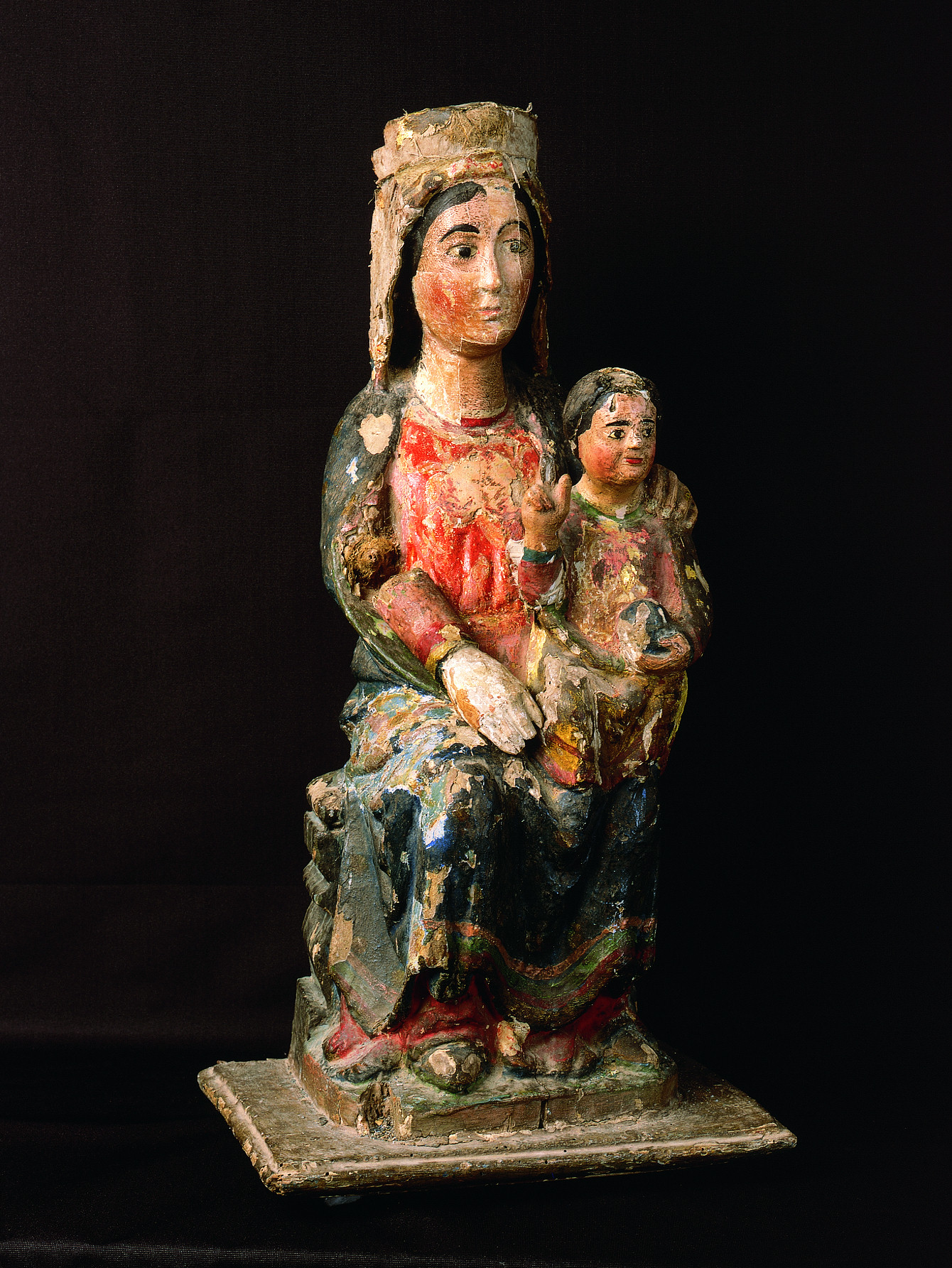 Las pérdidas de preparación eran muy numerosas. Donde se conservaba, la policromía que quedaba a la vista era un repinte generalizado que ocultaba una policromía de mayor calidad, dorada en numerosas partes. La capa de protección, a la cera, estaba muy oxidada y ennegrecida. También se había aplicado betún de Judea, especialmente en las carnaciones.