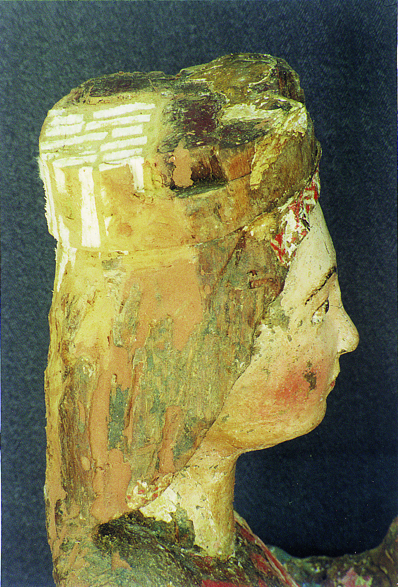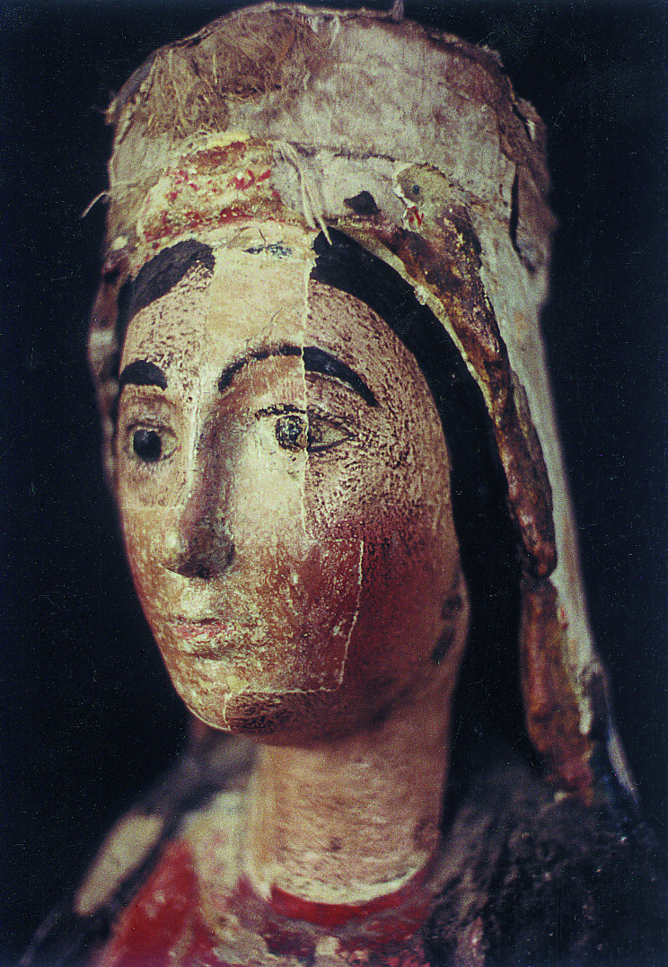 Bajo la policromía se podía observar a través de las zonas más dañadas una primera capa de estopa que recubre la madera por la espalda y cabeza de la Virgen, una tela blanca de refuerzo y la capa de preparación, constituida por sulfato cálcico, anhidrita y cola. Sobre la policromía anterior, y perfectamente adherida a ella, aparecía una gruesa capa de estucos, carbonatos según los análisis. Las contracciones y dilataciones de la madera habían hecho saltar por algunos sitios las capas de la policromía y habían producido pequeñas grietas en la peana. La tela blanca de refuerzo colocada sobre la capa de estopa se encontraba totalmente desprendida.