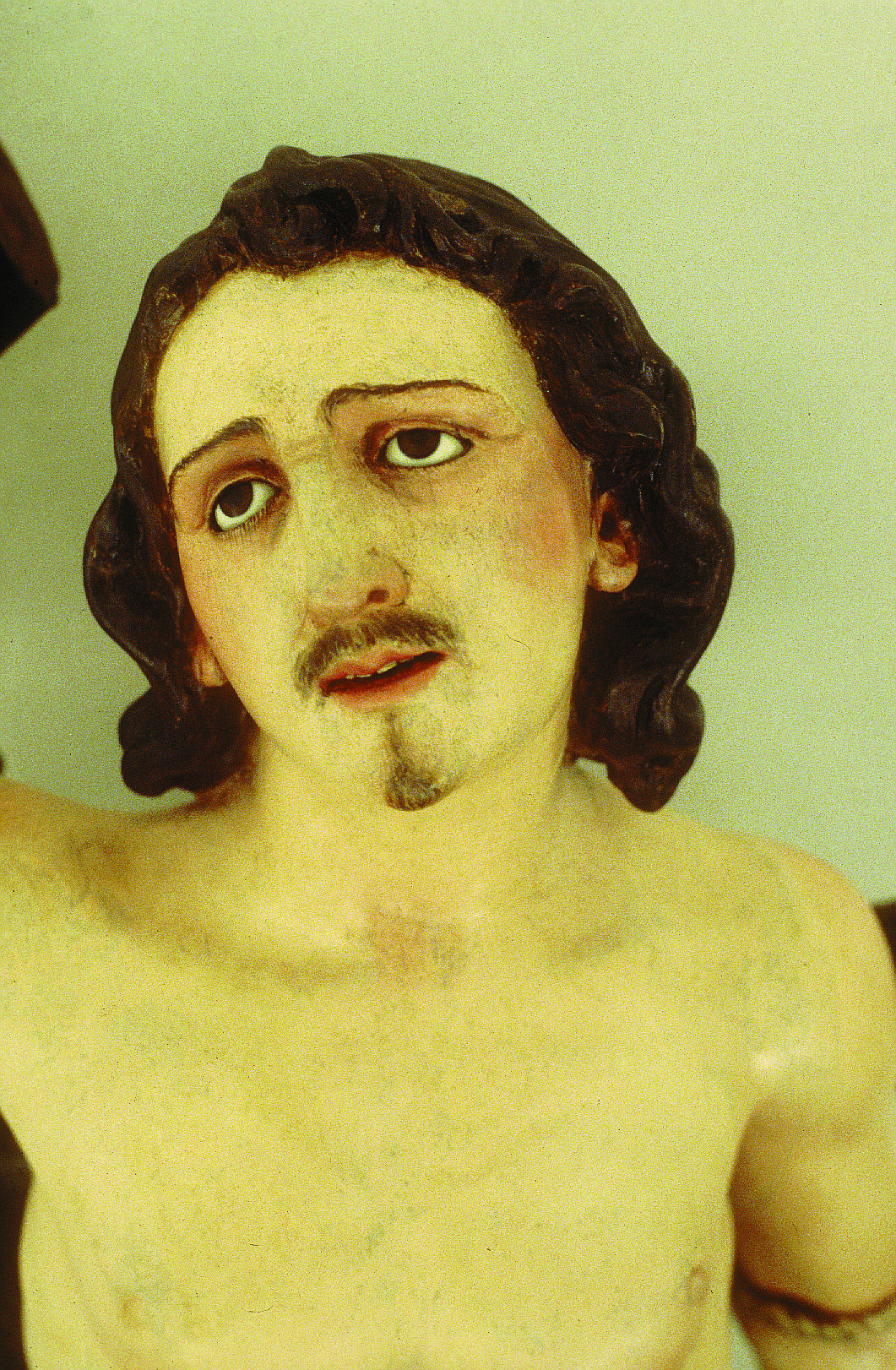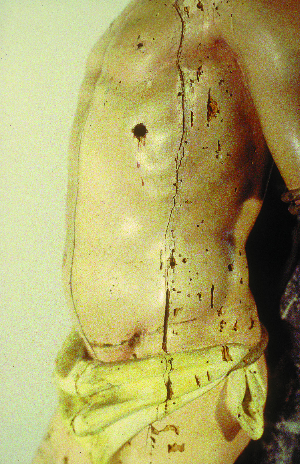 Sobre la policromía original se superponía otra de tonos más pálidos. En algunas zonas del rostro, antebrazos y manos podía adivinarse el estado de conservación de la más antigua, muy cuarteada y con muchas pérdidas. Una fina capa de cera permanecía en gran parte de la policromía entre ambas capas de color, como consecuencia de haberse tapado algunos agujeros de xilófagos con anterioridad a la aplicación de la segunda policromía. También se localizaban repintes sobre los rellenos de grietas.