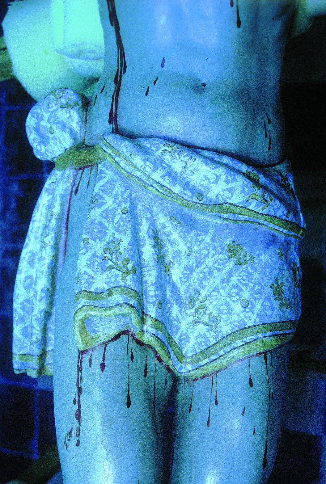 En el sudario se efectuaron diez microcatas, las cuales constataron que la policromía subyacente abarcaba toda la superficie del mismo; otras dos nuevas catas de mayor tamaño revelaron su buen estado de conservación. Con los resultados obtenidos se decidió eliminar el repinte. Esta operación, realizada a punta de bisturí, permitió que ahora se pueda contemplar el paño de pureza original. Posteriormente se rellenaron las grietas.