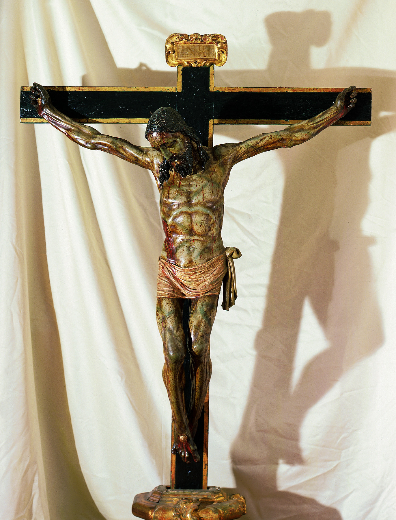 También se intervino en la cruz. A través de catas se pudo comprobar que los restos de pintura original eran muy escasos. Por ello se dejó la policromía que ofrecía en el momento de la restauración; tan solo se eliminaron los restos de pintura verde y los retoques con purpurina.