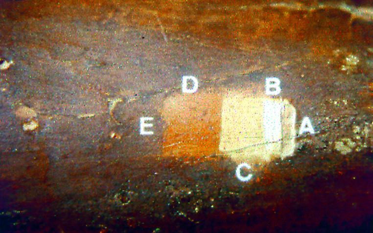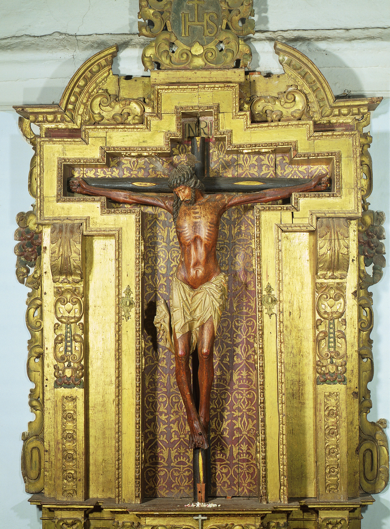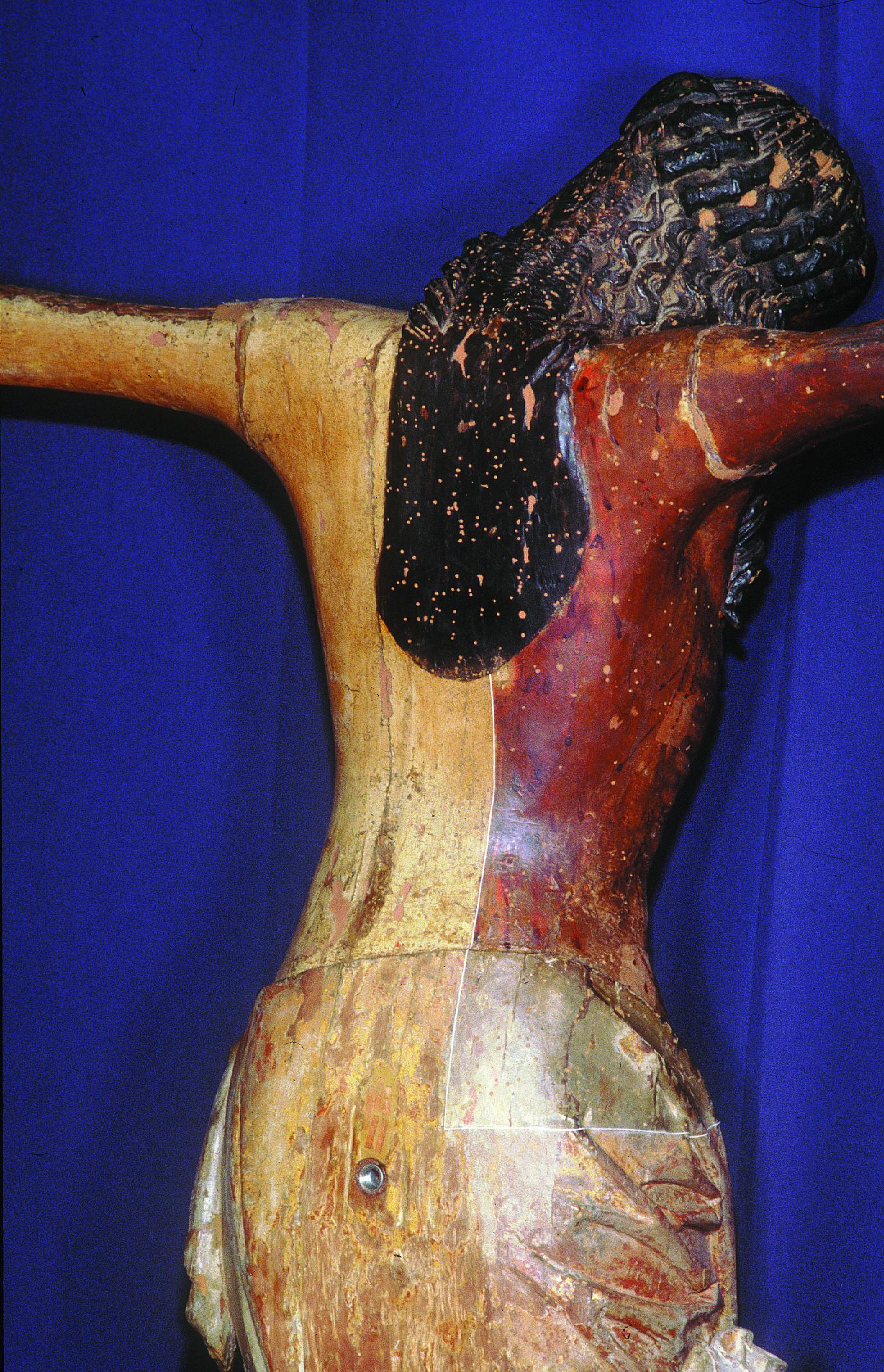 En la cruz también se apreciaban grandes depósitos de polvo, algunas grietas y un importante ataque de insectos xilófagos. La intersección de los travesaños se había realizado con un ensamble a media madera sujeto por una espiga en muy mal estado, lo que causaba un movimiento pendular. Algunas zonas se encontraban repintadas con purpurina.
