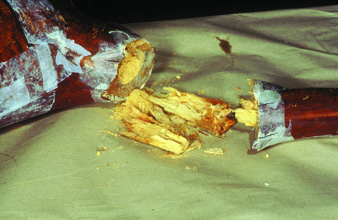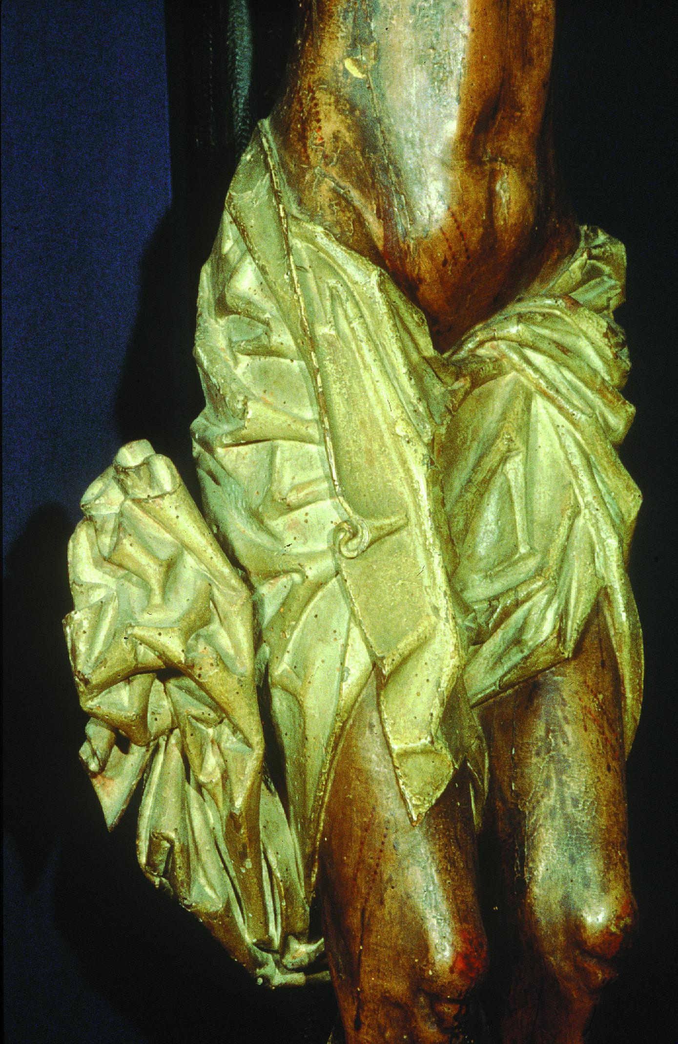 Se fijaron los estratos en peligro de desprendimiento, se extrajeron los elementos metálicos y se desinsectó y consolidó la madera a través de los agujeros existentes y de algunos taladros practicados para ello. Se desmontaron los brazos, la mano derecha y los dedos y se volvieron a espigar y ensamblar en su sitio. En los brazos hubo que eliminar las espigas originales por el deterioro que presentaban y sustituirlas por otras nuevas realizadas con fresno. Se limpiaron los restos de adhesivos y materiales acumulados en las grietas y fisuras y se repusieron las pérdidas con madera de cedro. El dedo falso se retiró y se talló uno nuevo.
