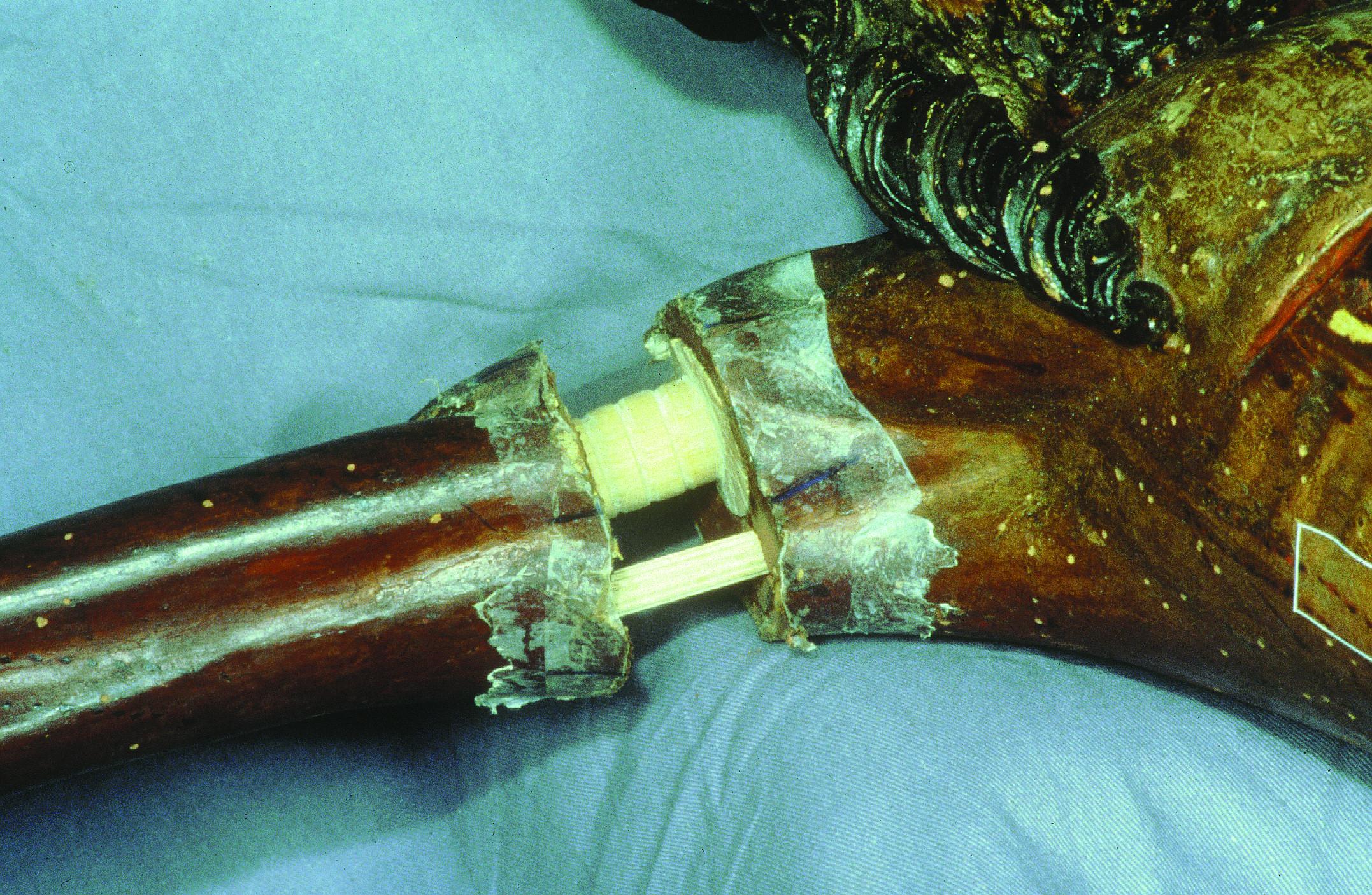 En cuanto a la cruz, se solucionaron los problemas de movimiento que presentaba. Se ajustaron correctamente los travesaños con dos nuevas espigas y se alargó el extremo inferior para evitar que los brazos rozaran con la hornacina que cobija la imagen.