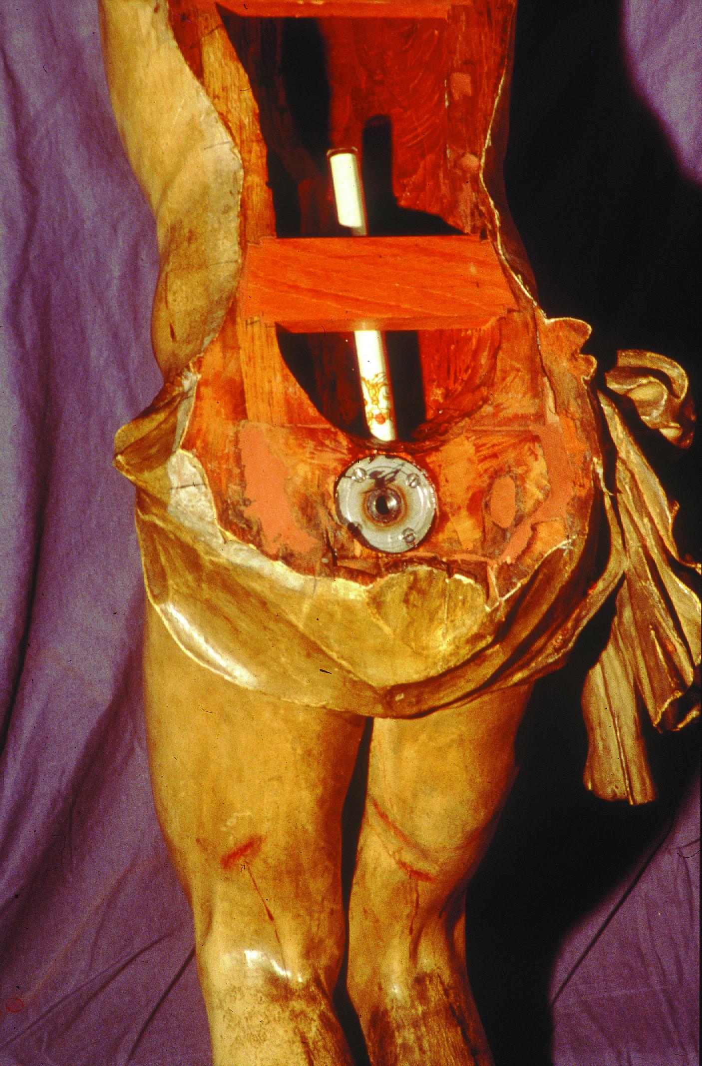 Una vez protegida la policromía en las zonas colindantes a los ensambles, se procedió a la separación de piezas -cabeza, brazos y tapa posterior del tórax- reblandeciendo los adhesivos e insertando cuñas. Todos los elementos metálicos aparecidos se eliminaron y se sustituyeron por espigas de madera de haya. En vista de que el sistema de sujeción a la cruz perjudicaba la conservación de la imagen, se realizó uno nuevo en acero inoxidable consistente en un tubo con rosca interior soldado a un disco, el cual se embutió en el plano inferior sobre el que descansa la tapa. También se aumentó la superficie de unión de la tapa al tronco añadiendo dos piezas de madera dispuestas a lo ancho ensambladas por sus extremos a los bordes del hueco interior del tronco. La zona que alojaba el antiguo anclaje se reconstruyó, al igual que una falange desaparecida de la mano derecha, y la unión de las dos piezas que forman la tapa se reforzó con toledanas.