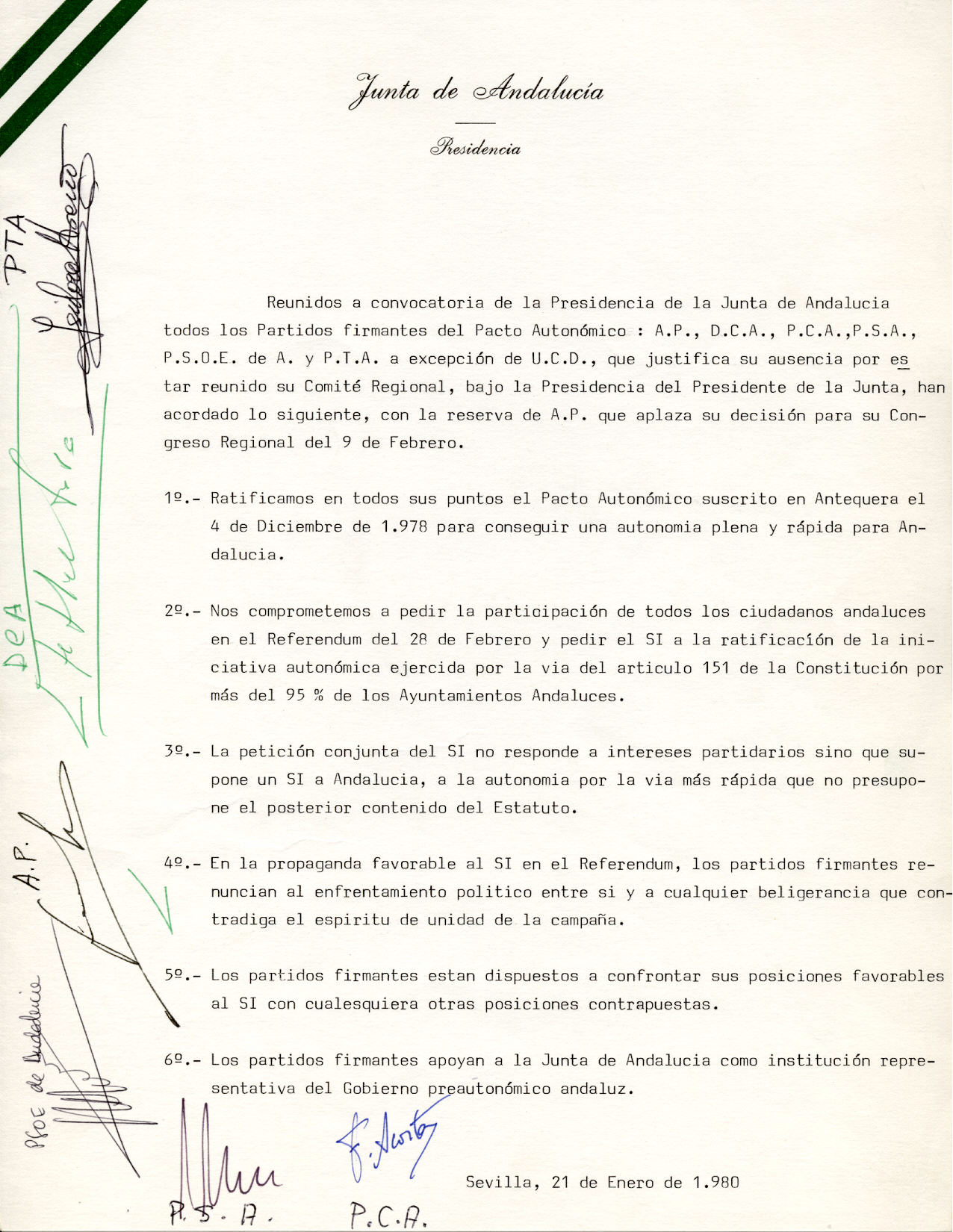 El 21 de febrero de 1980 acuden a la firma del documento, en la sede la Presidencia de la Junta de Andalucía, representantes de Alianza Popular, Democracia Cristiana de Andalucía, Partido Comunista, Partido Socialista de Andalucía, Partido Socialista Obrero Español y Partido del Trabajo.
