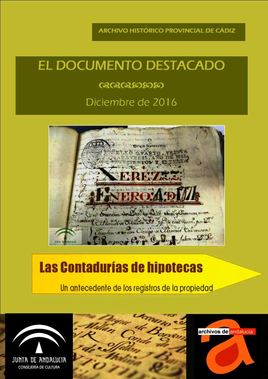"El amplio fondo de Contadurías de Hipotecas -1768/1870- que custodia el Archivo Histórico Provincial de Cádiz, con un volumen de 670 libros, procedentes de casi todos los antiguos distritos judiciales, es fundamental para investigar las cargas o traslaciones de dominios que se ejecutaban sobre los bienes inmuebles, tanto urbanos como rústicos. De esta manera podemos conocer como una finca en cuestión ha ido pasando de mano en mano, - hipotecas, arrendamientos, compraventas, etc.- y cuáles han sido los poseedores de estas a lo largo de casi un siglo.