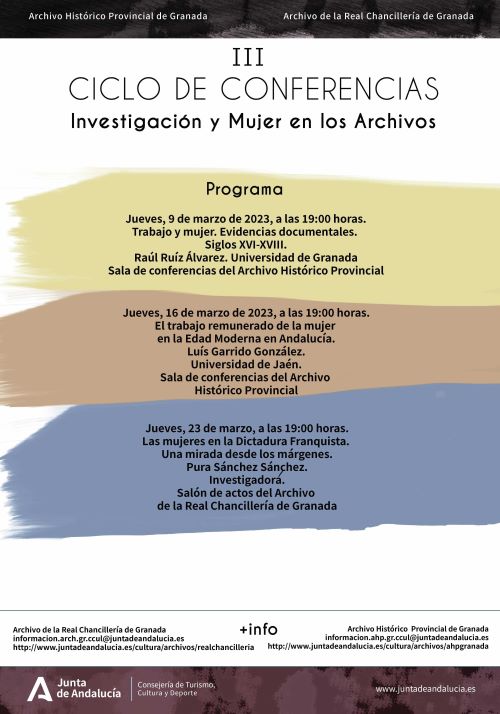 Con motivo del Día Internacional de la Mujer, el Archivo Histórico Provincial de Granada y el Archivo de la Real Chancillería de Granada organizó un ciclo de conferencias, dedicado a la investigación sobre mujeres en los archivos históricos. Durante los jueves 9, 16 y 23 de marzo, se pudo asistir a las conferencias presenciales que tuvieron lugar en las sedes de ambos archivos a las 19:00 h.
