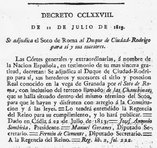 Ese es el caso de nuestro documento, que recoge las Cesión del Real Soto de Roma y terrenos cercanos al Duque de Wellintong por las Cortes de Cádiz, en premio a su contribución en la Guerra de la Independencia.