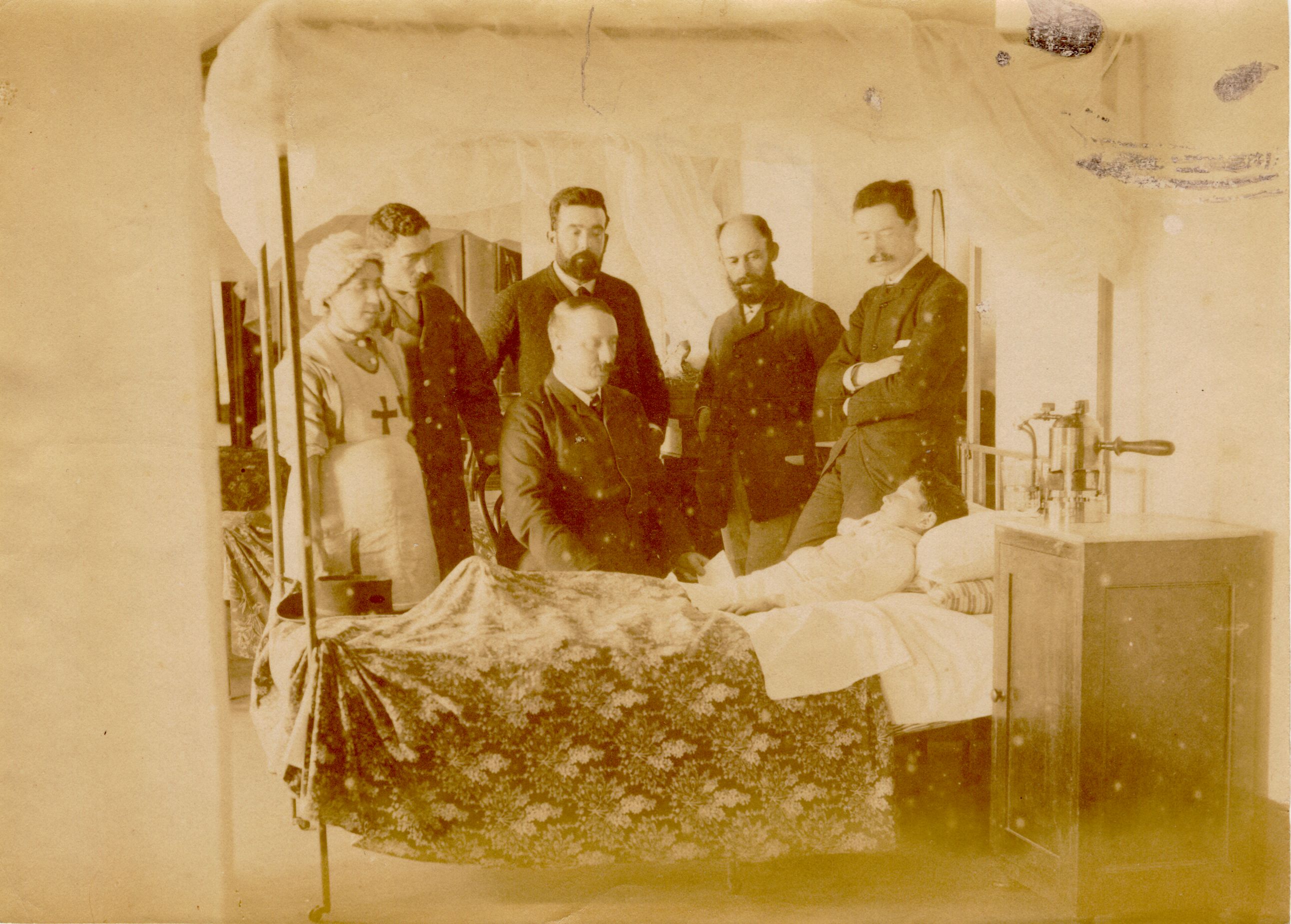 Interior del hospital de Riotinto, con los doctores MacKay y Sánchez sobre un enfermo. Fecha [ca. 1895]. AHPH. Colección fotográfica de la Compañía de Riotinto, signatura F-003/0022.