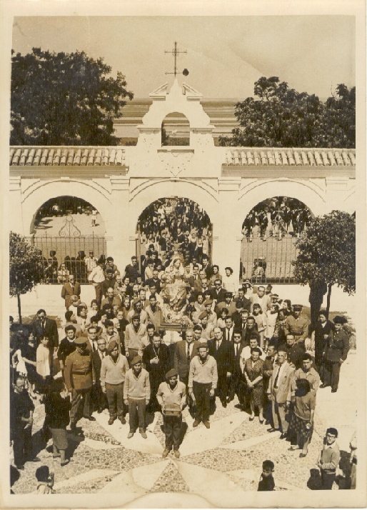 | Misión Juvenil Virgen de la Cinta. Salida de la procesion desde el Santuario de la Cinta. Huelva. Sin fecha. AHPH. Colección fotográfica del Frente de Juventudes, signatura F-018/0026. |