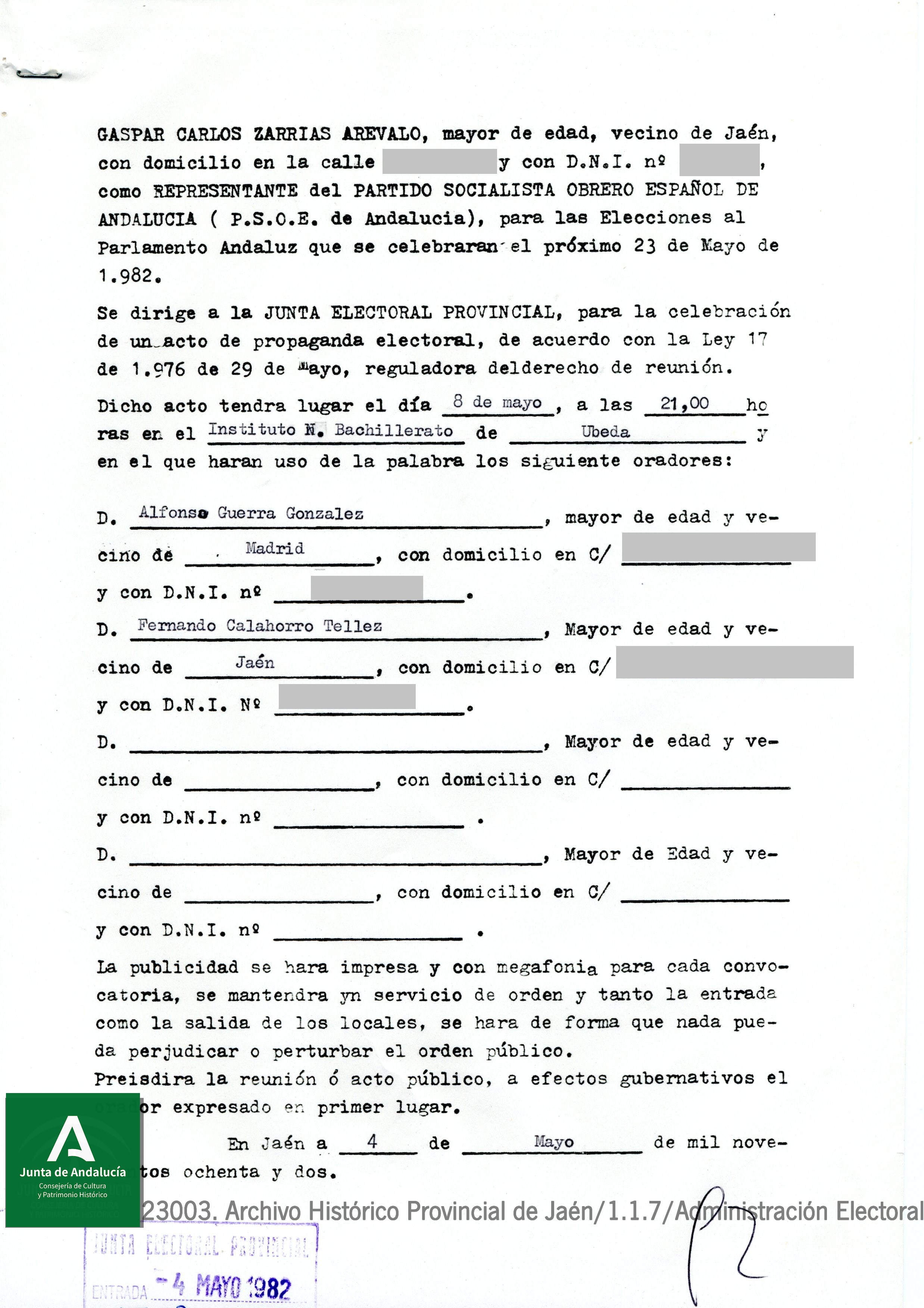 - Documento 5. Solicitud de un acto público del Partido Socialista Obrero Español en Úbeda presidido por Alfonso Guerra (JPG 2.47 MB)