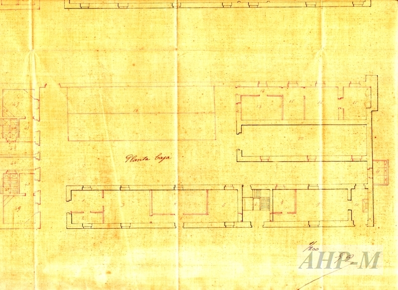 [1864-1865]. Málaga. Archivo Histórico Provincial de Málaga. Sección Fomento. Sig. 26826/25. MPD. 15398. Planta general y planta baja de la Granja de San Pedro de Alcántara. Plano (detalle); papel tela. ECB.