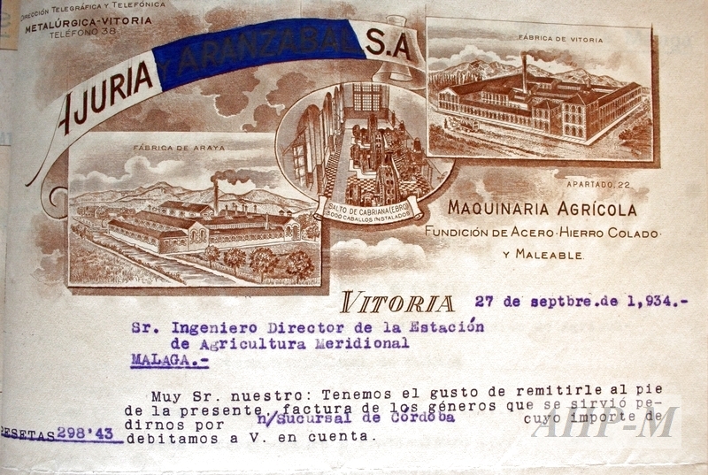 1934, septiembre, 27. Vitoria. Archivo Histórico Provincial de Málaga. Centro de Investigación y Formación Agraria Sig.74733. Membrete de la fábrica de maquinaria agrícola Ajuria y Aranzabal S.A. ubicada en Vitoria. Factura. Observ.: los membretes permiten el estudio de los diseños de determinadas épocas y además son en muchas ocasiones, fiel reflejo de los edificios de fábricas, de la maquinaría y de las manufacturas. MFE.
