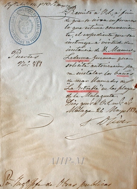 1890, mayo, 26. Málaga. Archivo Histórico Provincial de Málaga. Sección Fomento. Sig. 73983/1. El Señor Oliver solicita al Ingeniero Jefe de Obras Públicas de Málaga información sobre el estado del expediente relativo a la autorización para instalar los baños de “La Estrella” en las playas de la Malagueta. Instancia. ECB.
