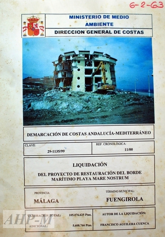 1999. Fuengirola. Archivo Histórico Provincial de Málaga. Demarcación de Costas. Sig. 75.270/5. La Demarcación de Costas de Andalucía elabora el proyecto de restauración del borde marítimo de la playa Mare Nostrum (Fuengirola), que incluye la demolición de: un hotel, muros y pistas deportivas, y el desmontaje de farolas y otros. Proyecto de restauración “Playa Mare Nostrum”; liquidación. 139 págs.; autor y director de la obra: Francisco Aguilera Cuenca; Ingeniero Jefe de la Demarcación: Luís López Peláez; 2 planos. JAV.
