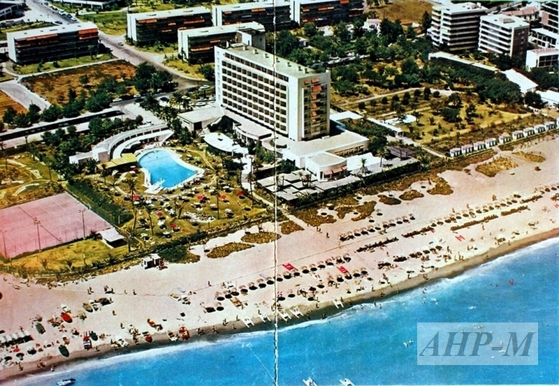 [1970-1980]. Torremolinos. Archivo Histórico Provincial de Málaga. Delegación Provincial de Información y Turismo. Sig. 73.073. Hotel Pez Espada y su entorno, incluyendo la playa de Torremolinos, jardines, piscina e instalaciones deportivas. Postal color; 14,6 x 10,2 cm. JAV.
