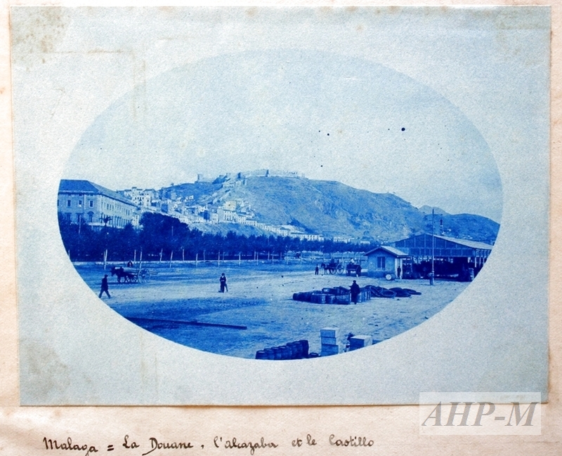 [1907]. Málaga. Archivo Histórico Provincial de Málaga. Archivo Louis Agel. 3/3-224 (Álbum). Málaga=La Douane, l´Alcazaba et le Castillo. Fotografía; b/n con viraje en azul. Observ.: el cónsul francés L. Agel estuvo interesado en el puerto de Málaga y en su actividad, lo cual permite conocer: el puerto y sus instalaciones, las cargas y los fletes, en este caso se observa un tinglado, toneles y cajas para su embarque y sistemas de transporte. ECB.