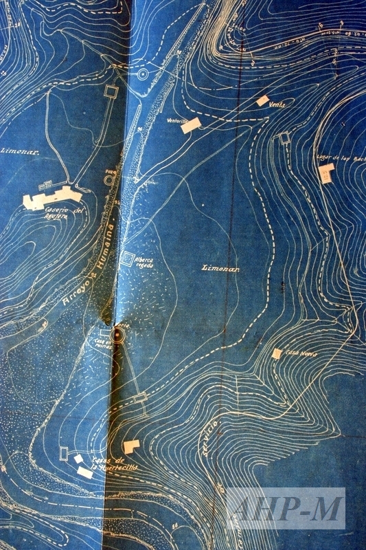 1909. [Málaga]. Archivo Histórico Provincial de Málaga. Sección Confederación Hidrográfica. Sig. 46.560. Plano general del pantano del Agujero. Proyecto; plano (detalle); ingeniero: M. Jiménez Lombardo. Observ.: Se pueden apreciar: el acueducto de San Telmo, casas, norias, albercas y, fundamentalmente, lagares. JMG.