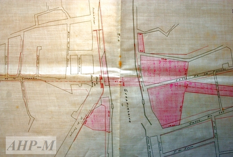 1908, julio, 17. Málaga. Archivo Histórico Provincial de Málaga. Sección Fomento. Sig. 25280/19. Zona para el emplazamiento del Puente de la Aurora. Plano en papel tela; fragmento. Observ.: En la carátula figura: Plano de la zona que se necesita para establecer un puente emplazado sobre la máxima avenida de 1907 de 42 metros de longitud y 12 de ancho para el paso de vehículos sobre el río Guadalmedina, frente a la plaza de Puerta Nueva, con rampas de acceso en ambas márgenes y apertura de nueva calle para enlazar con la de Mármoles y carretera de Cuesta del Espino a Málaga. ADS.
