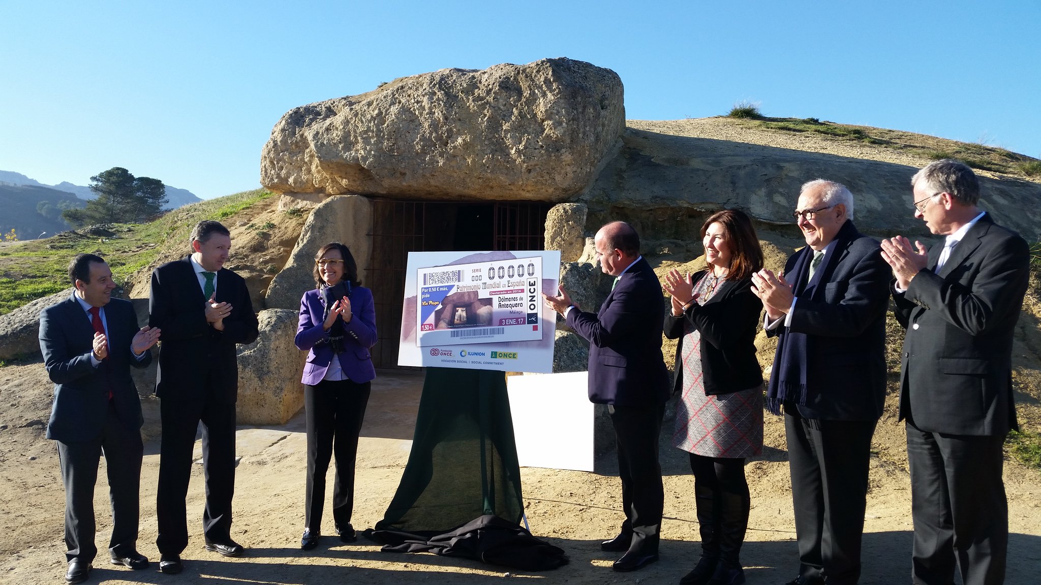 La consejera de Cultura, Rosa Aguilar, ha presentado hoy en el conjunto arqueológico de los Dólmenes de Antequera la imagen del cupón con el que la ONCE llevará por toda España el próximo 3 de enero el valor patrimonial de este espacio gestionado por la Junta de Andalucía y que el pasado mes de julio fue declarado Patrimonio Mundial por la Unesco. Ahora, cinco millones y medio de cupones reproducirán la imagen del conjunto con la leyenda: Dólmenes de Antequera, Málaga, Patrimonio Mundial en España.