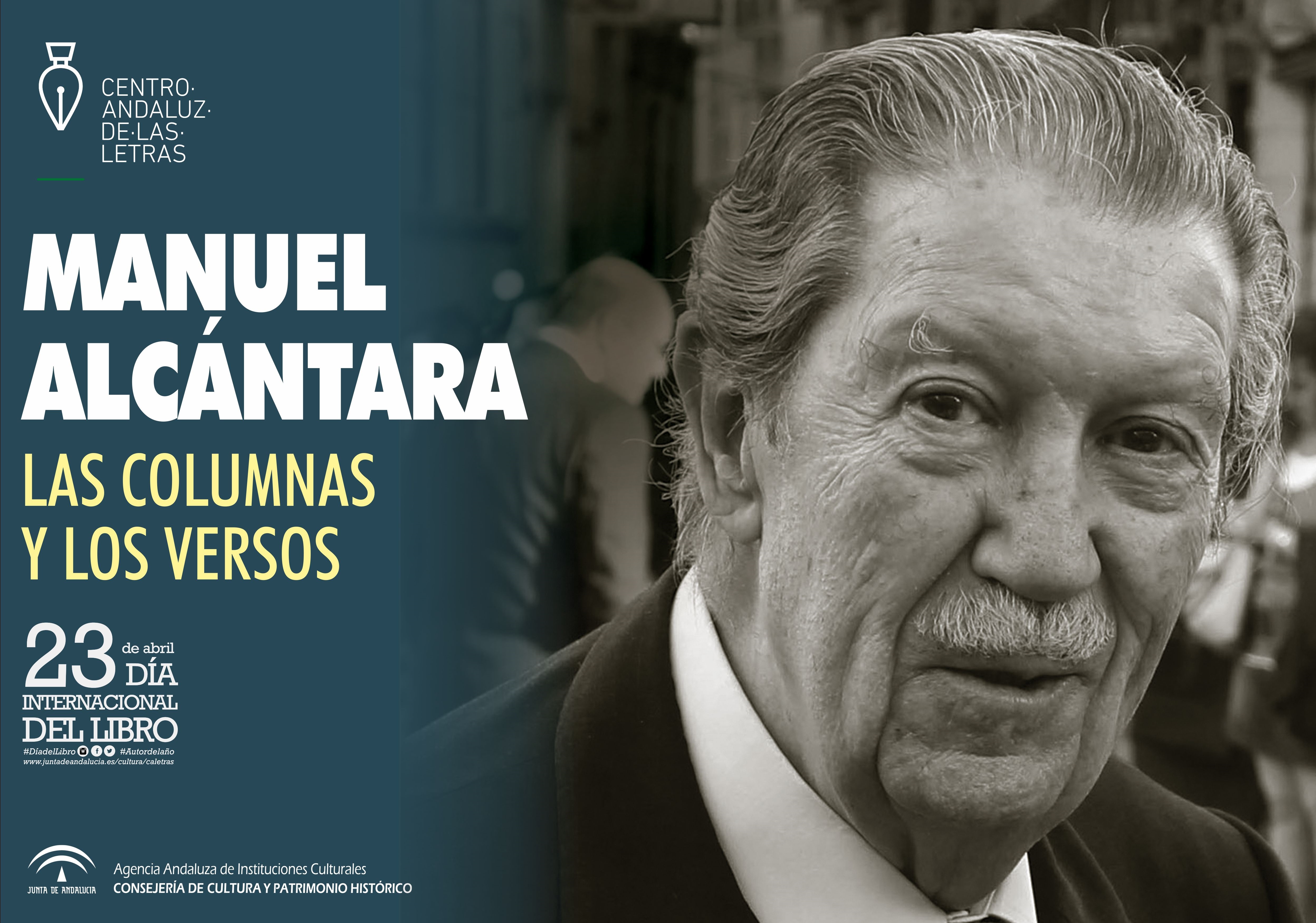 La Consejería de Cultura y Patrimonio Histórico, a través del Centro Andaluz de las Letras, ha organizado un completo programa de actividades para celebrar el 23 de abril, Día Internacional del Libro, dedicado en esta ocasión al poeta y periodista Manuel Alcántara, designado como Autor del Año 2019. Entre los actos organizados se incluyen, entre otros, la inauguración de una exposición, la edición de una antología y conferencias a cargo de especialistas en las ocho provincias andaluzas.