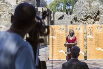 La consejera de Cultura y Patrimonio Histórico, Patricia del Pozo, ha presentado esta mañana el nuevo festival de las artes escénicas andaluzas, ‘Anfitrión’, que se celebrará a lo largo de los meses de julio y agosto en los teatros romanos de Itálica (Sevilla) y Baelo Claudia (Cádiz), en la Alcazaba de Almería y en las Cocheras del Puerto de Huelva, con el propósito de reactivar al sector de forma inmediata y favorecer el reencuentro entre el público y los creadores andaluces.