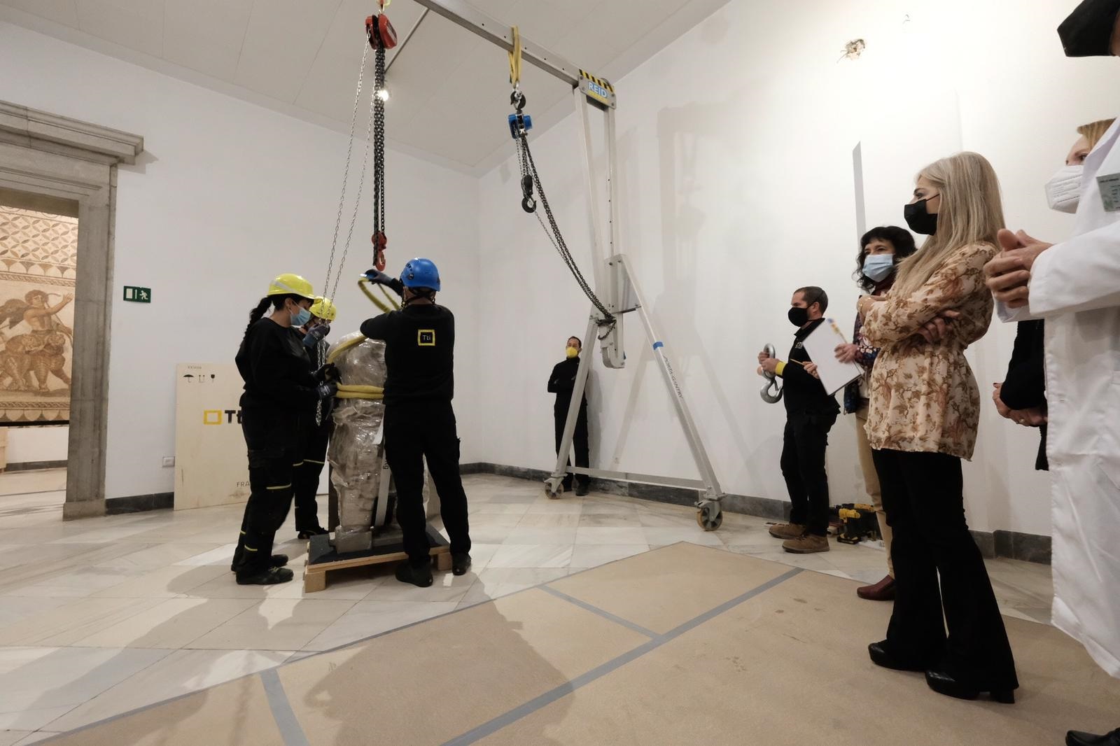 Acompañada por la secretaria general de Innovación Cultural y Museos, Mar Sánchez Estrella, y la directora del Museo, Marisol Gil de los Reyes, la consejera Patricia del Pozo ha afirmado que, con las actuales previsiones y una vez que se concluyan los trabajos embalaje y almacenamiento en el mes de febrero con la actuación del Instituto del Patrimonio Cultural de España (IPCE) en las grandes esculturas, epígrafes y mosaicos, se necesitarán dos meses y alrededor de 150 traslados en camión para completar el transporte traslado al Centro Logístico del Patrimonio Cultural (CLPC) de San José de la Rinconada (Sevilla).
