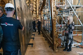 La consejera Del Pozo, acompañada por el hermano mayor de la Caridad, Félix Arenado, y la directora del Bellas Artes de Sevilla, Valme Muñoz, ha asistido al desmontaje del lienzo ‘Moisés haciendo brotar el aguar de la roca de Horeb’, ejecutado por Murillo y emplazado a varios metros de altura en el muro del Evangelio del anteprebisterio de la iglesia.